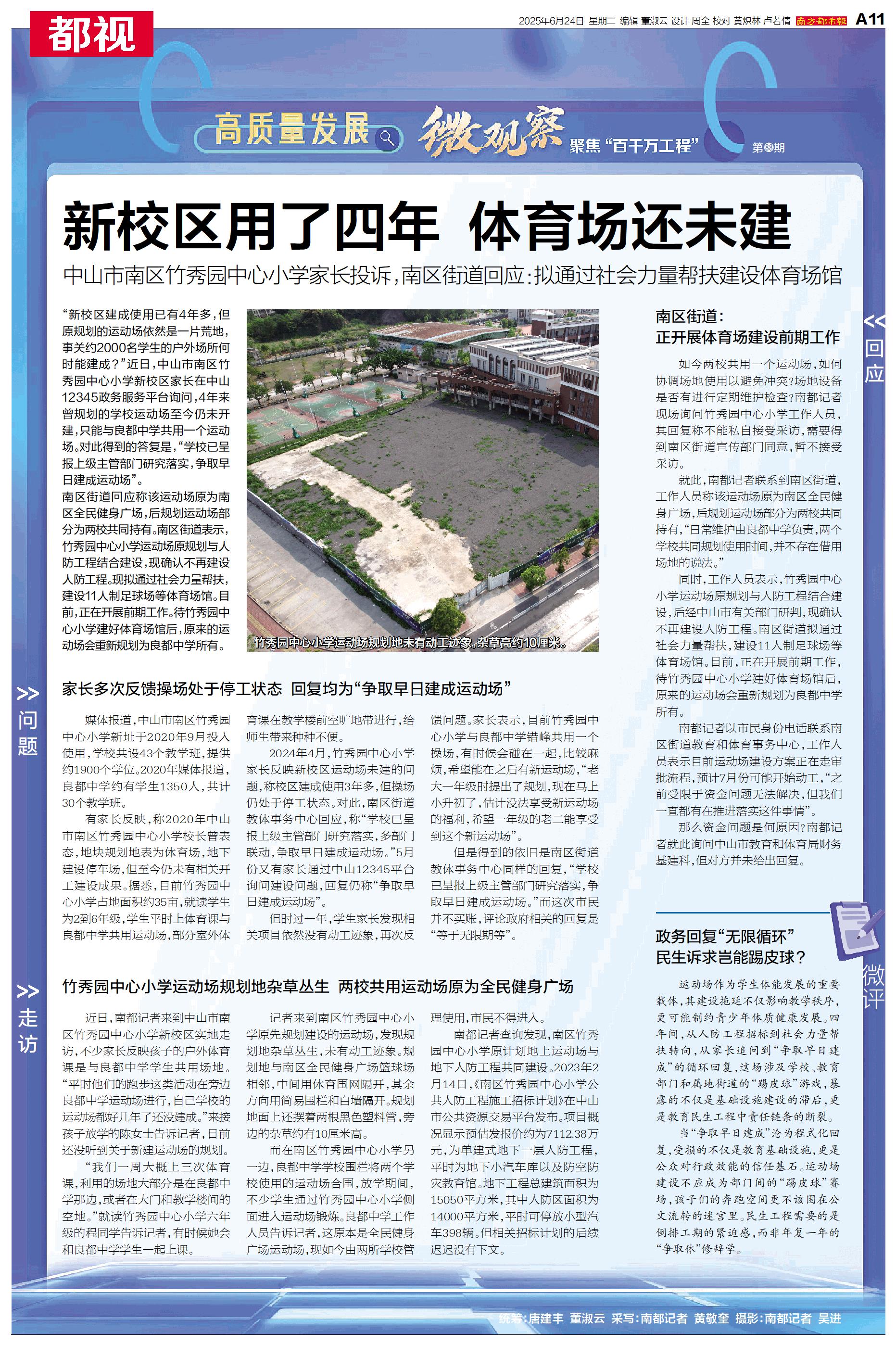 近日,中山市南区竹秀园中心小学新校区家长在中山12345政务服务平台询问,4年来曾规划的学校运动场至今仍未开建,只能与良都中学共用一个运动场。