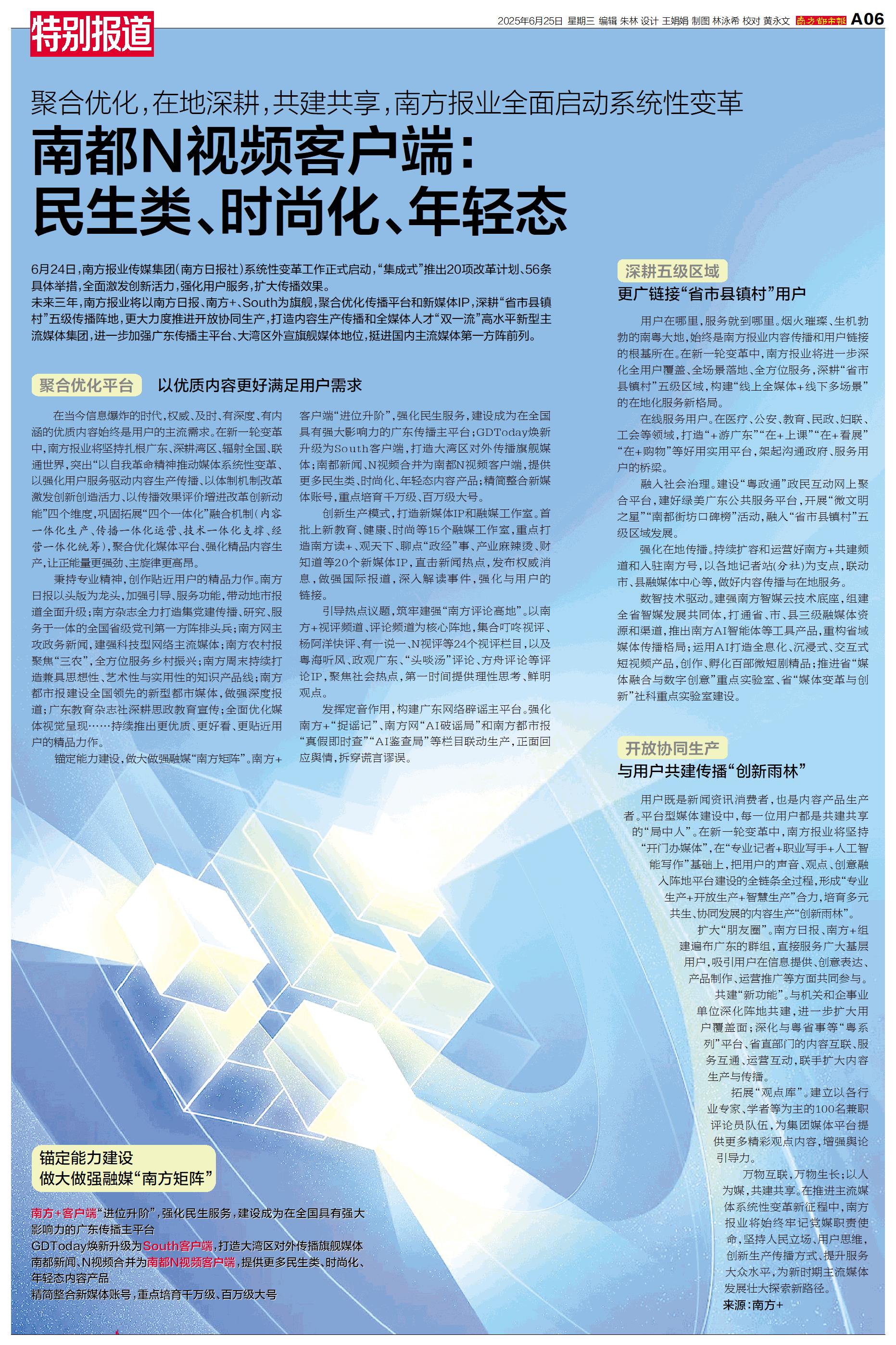 6月24日,南方报业传媒集团(南方日报社)系统性变革工作正式启动,“集成式”推出20项改革计划、56条具体举措,全面激发创新活力,强化用户服务,扩大传播效果。