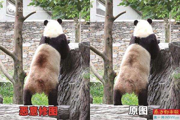 针对“大熊猫背部怎么好像有个‘血洞’”“不会是被虐待了吧”的传言,中国大熊猫保护研究中心6月24日发布文章澄清表示,“那是毛色,不是血色;那是光影,不是血迹;那是物理性压塌,不是生理性创伤”。该中心还附上了多张“恶意修图”前后对比图。