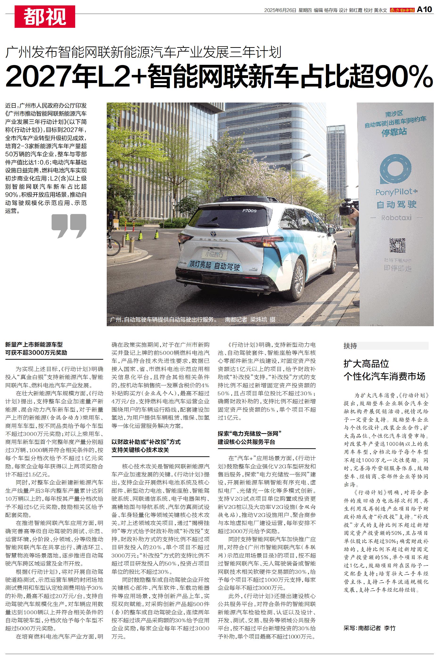 近日,广州市人民政府办公厅印发《广州市推动智能网联新能源汽车产业发展三年行动计划》。