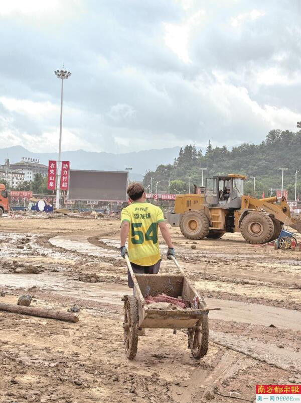这群绿茵场上的明星球员,脱去球衣和球鞋,换上T恤和雨靴,如同球场上各司其职,抗洪现场也各就其位,“我们球员有的去球场一线清淤,有的去后方准备盒饭,还有的留守村里守卫家园……”