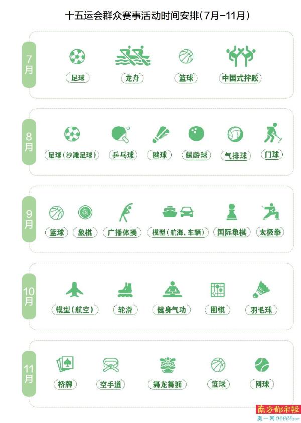 此前,十五运会群众赛事活动首赛定向项目比赛已经在茂名圆满收官,共产生6枚金牌。接下来,还有更多民间高手将登场比试。据十五运会组委会介绍,根据岭南气候特点和人群特点,约有18%的户外项目,安排在5-6月份,约28%的室内比赛项目,安排在7-8月份的暑假,便于学生群体参与,约54%赛事活动,安排在气候宜人的9-11月,其中有3项赛事活动,安排在开闭幕式期间举办,实现“月月有比赛、全程不断档”。