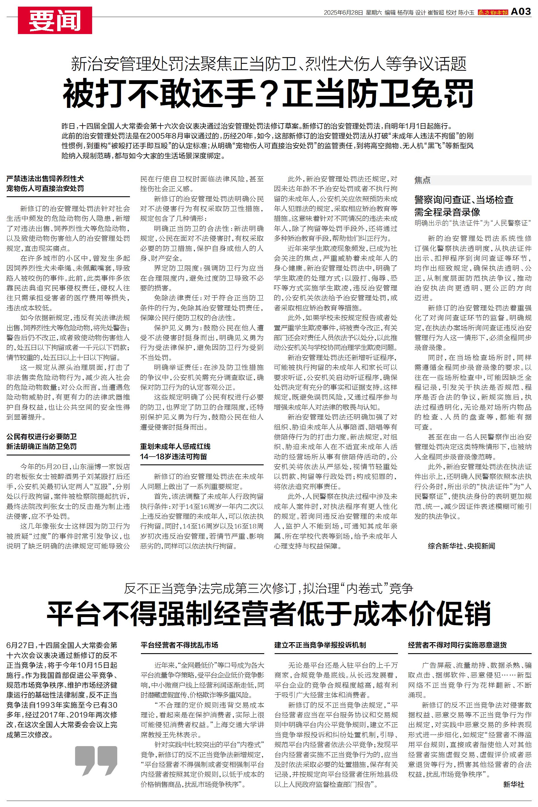 昨日,十四届全国人大常委会第十六次会议表决通过治安管理处罚法修订草案。新修订的治安管理处罚法,自明年1月1日起施行。