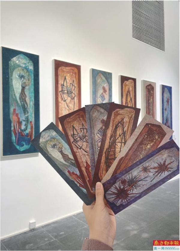 开展仅三天,就读工艺美术专业的郑晓仪的岩彩画《梦里梦外》文创衍生品珠光明信片、反转胶片和自己纯手工做的烧箔工艺小画就已经卖了1.8万元。