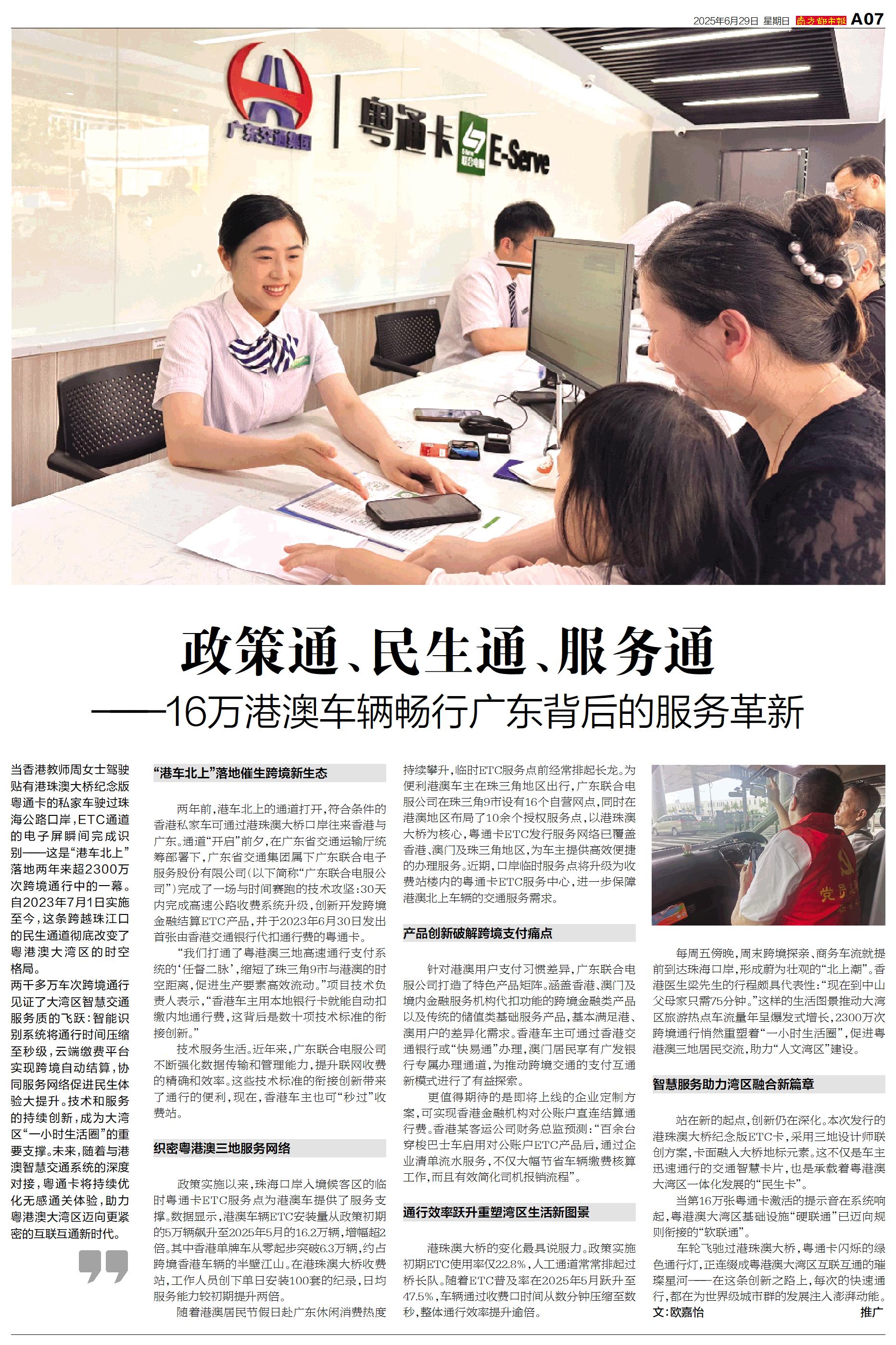 技术服务生活。近年来,广东联合电服公司不断强化数据传输和管理能力,提升联网收费的精确和效率。这些技术标准的衔接创新带来了通行的便利,现在,香港车主也可“秒过”收费站。