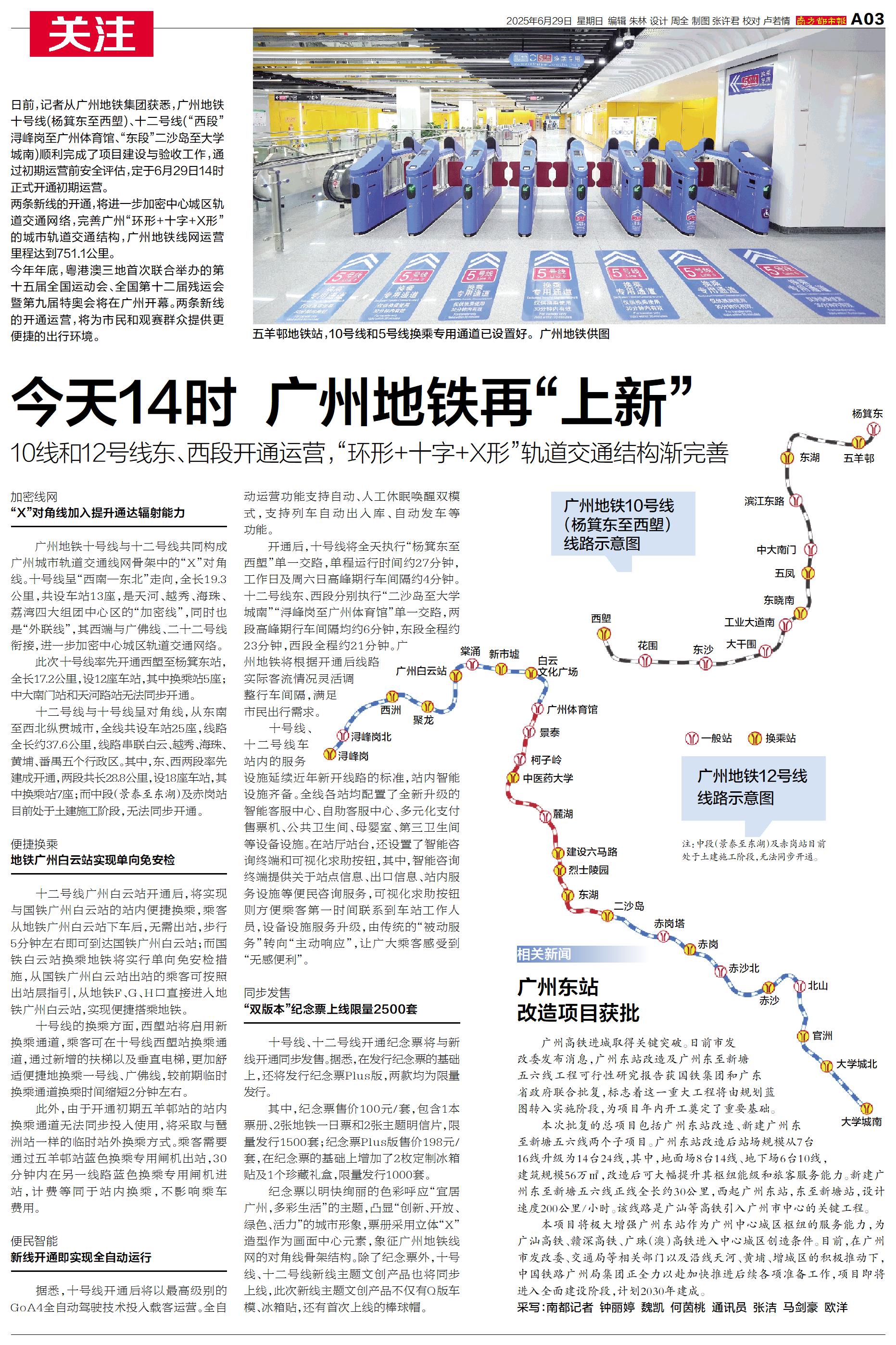 日前,记者从广州地铁集团获悉,广州地铁十号线(杨箕东至西塱)、十二号线(“西段”浔峰岗至广州体育馆、“东段”二沙岛至大学城南)顺利完成了项目建设与验收工作,通过初期运营前安全评估,定于6月29日14时