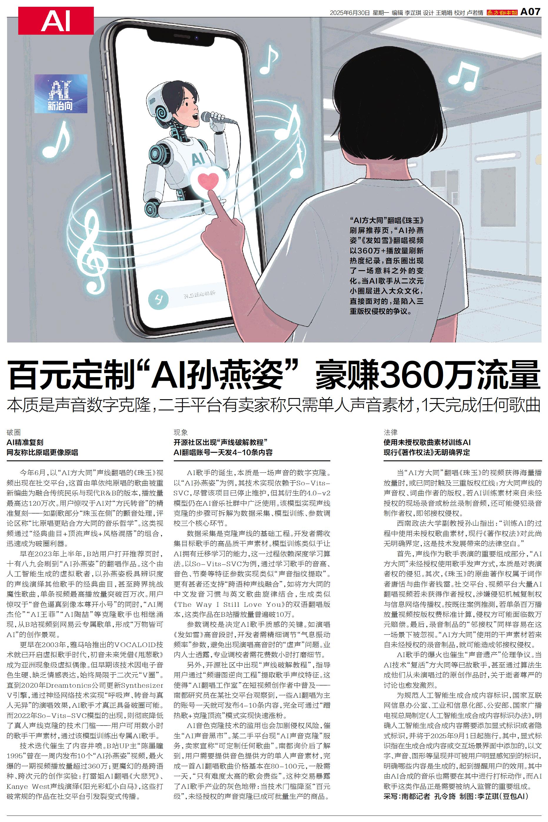 百元定制“AI孙燕姿” 豪赚360万流量