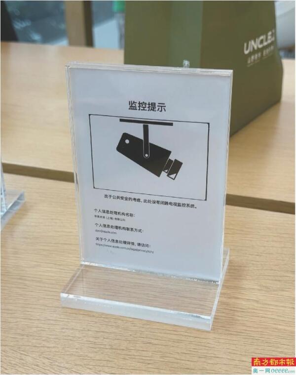 另据社交平台网友反映,在杭州万象城的苹果门店内,桌上摆放有“监控提示”的立牌,提示顾客“此处设有闭路电视监控系统”,立牌上还明确告知了个人信息处理机构的名称、联系方式,并附上介绍个人信息处理详情的网址。