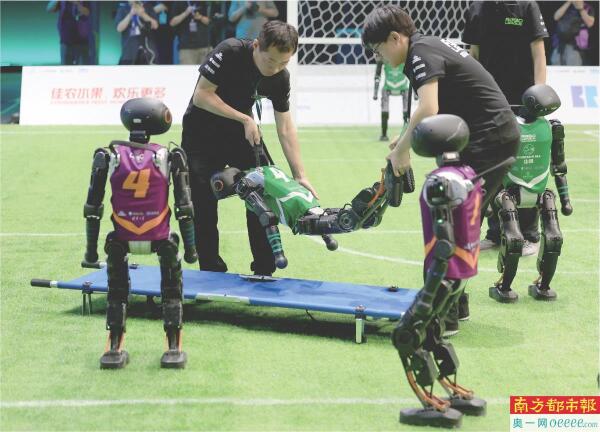 人形机器人摔倒在了足球场,动弹不得。两名人类担架员匆忙跑上场地,将“受伤”的机器人抬上担架,转移至场边休整。