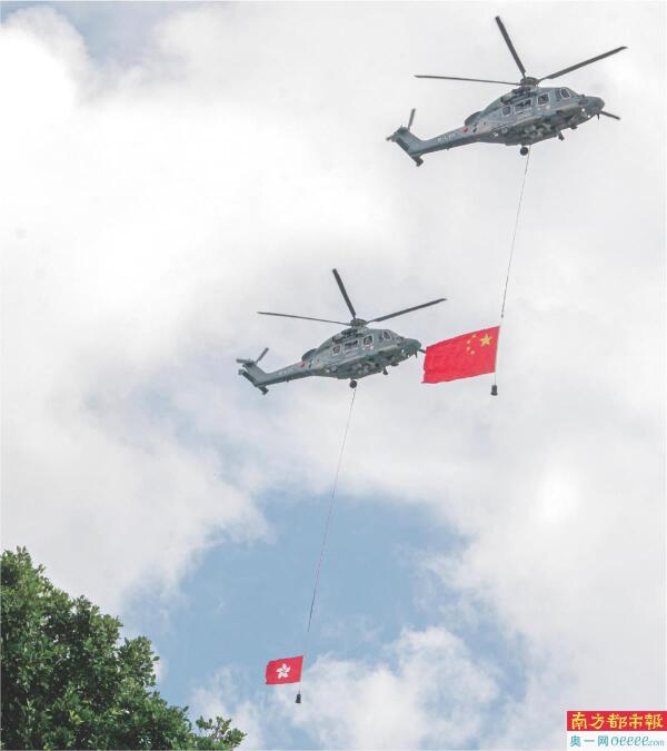 7月1日,香港特区政府在金紫荆广场举行升旗仪式,庆祝香港回归祖国28周年。这是分别悬挂中华人民共和国国旗、香港特区区旗的直升机从空中飞过。 新华社发