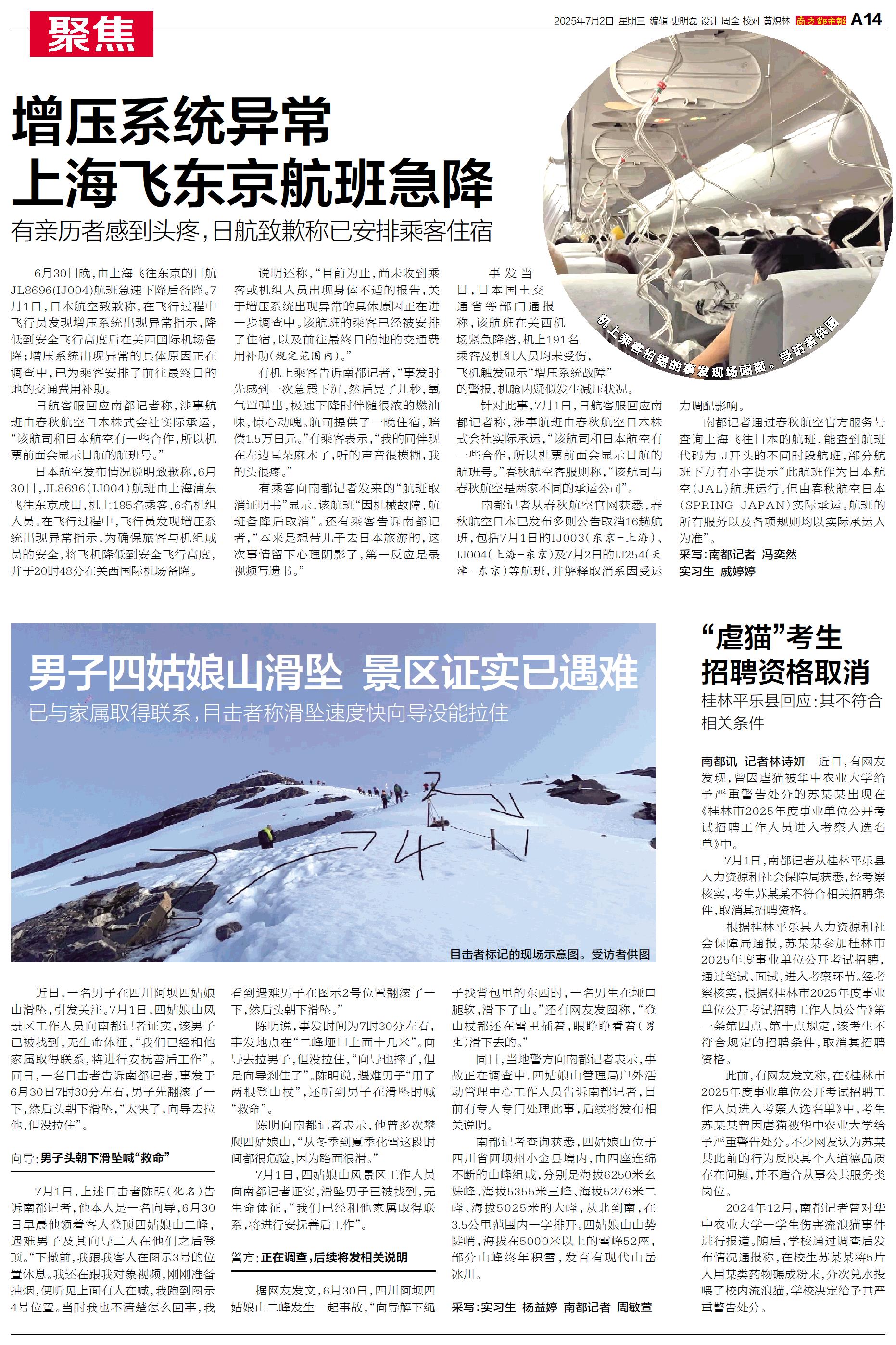 6月30日晚,由上海飞往东京的日航JL8696(IJ004)航班急速下降后备降。