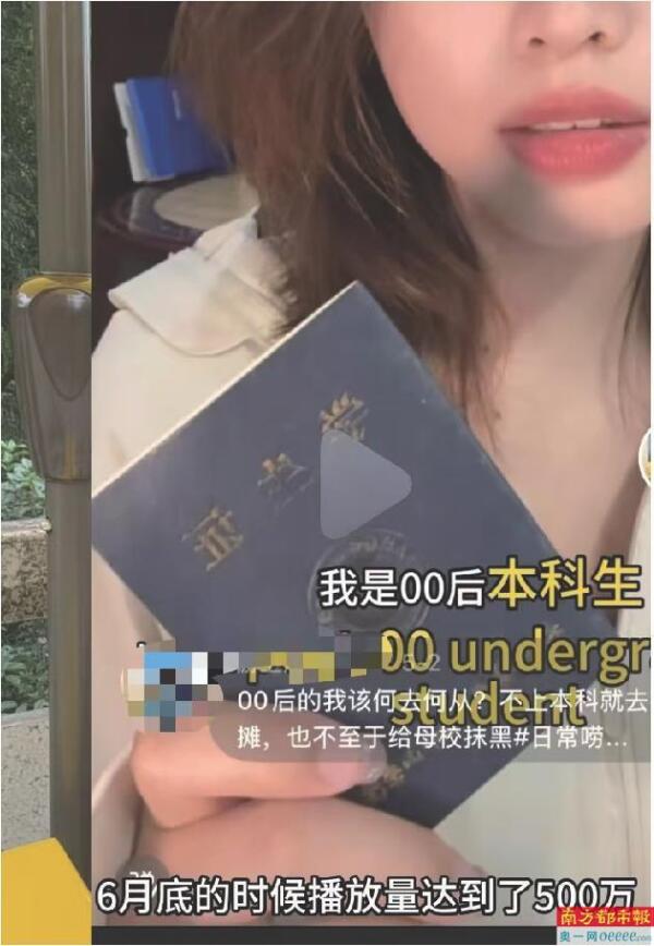 此前,一名女生以“本科毕业摆摊”为题持续发布视频。其主页资料自称“2022年毕业,上过两年班,目前失业中,医学生脱产考公”。该博主在7月1日发布的视频称,之前有网友质疑其“本科摆摊”系为吸引流量,她在5月底发布了视频展示了自己的毕业院校证明后被大量转发,“6月底的时候播放量达到了500万”。