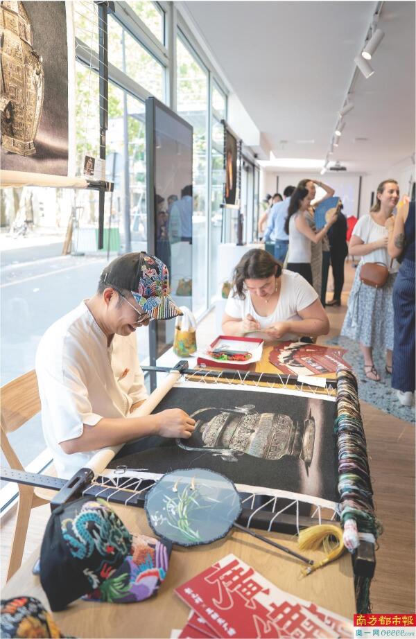 广东文旅海外推广中心揭牌仪式现场,广绣大师王新元向外国观众展示广绣技艺。