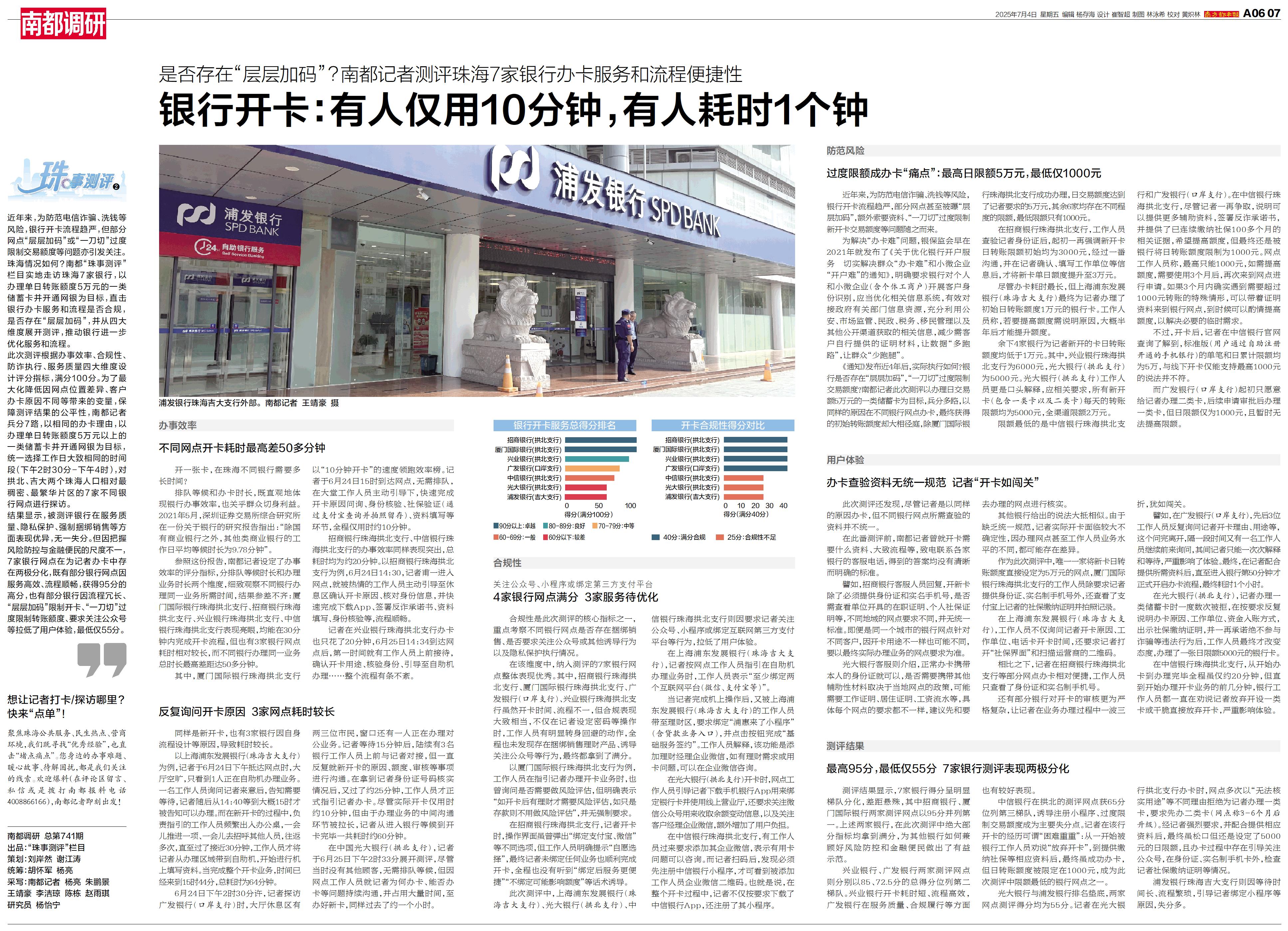 珠海情况如何?南都“珠事测评”栏目实地走访珠海7家银行,以办理单日转账额度5万元的一类储蓄卡并开通网银为目标,直击银行办卡服务和流程是否合规,是否存在“层层加码”,并从四大维度展开测评,推动银行进一步优化服务和流程。