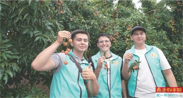 在佛冈汤塘镇四九村荔枝果园,外国友人现场采摘荔枝。