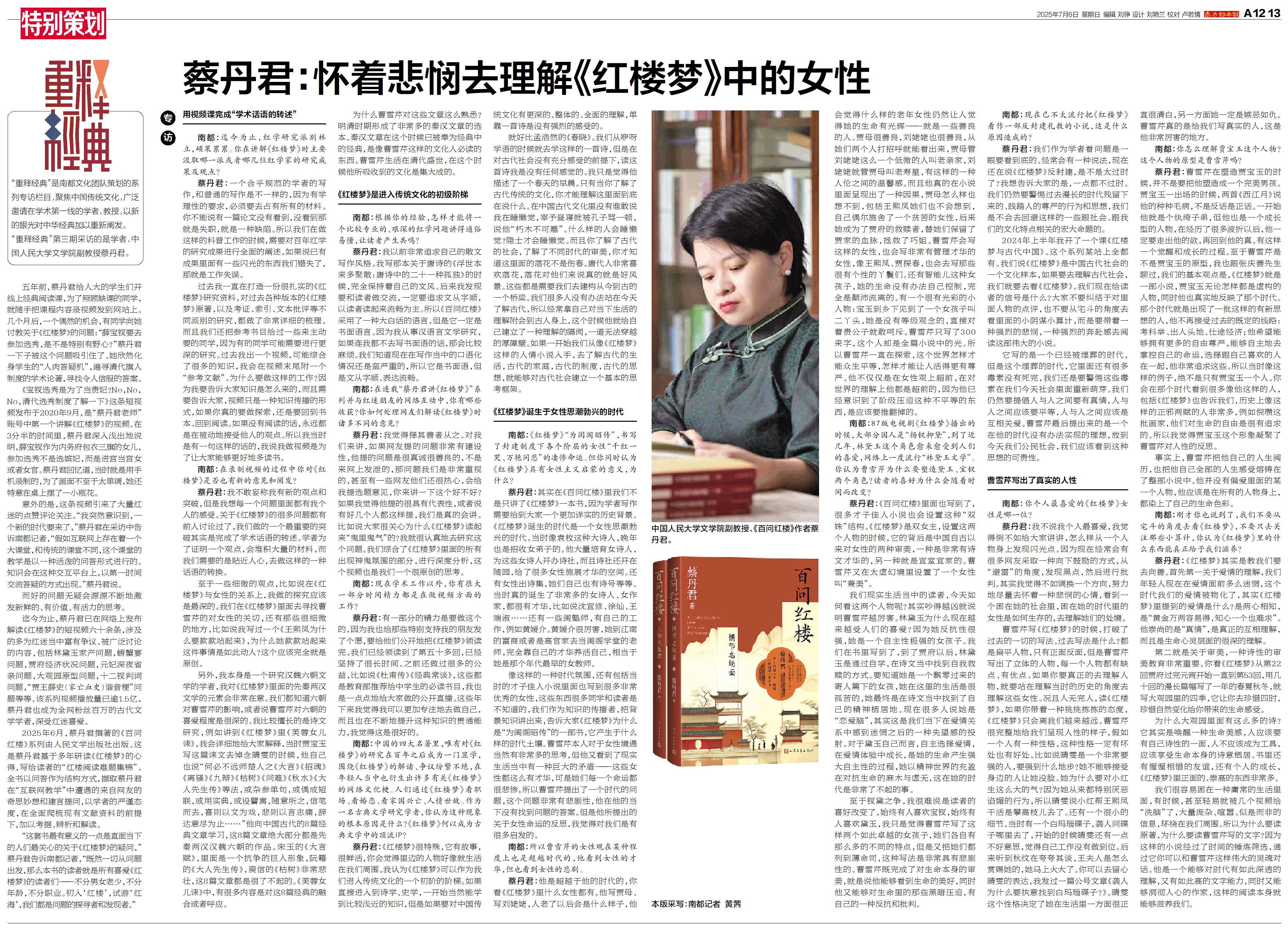 南都:在连载“蔡丹君讲《红楼梦》”系列并与红迷朋友的网络互动中,你有哪些收获?你如何处理网友们解读《红楼梦》时诸多不同的意见?