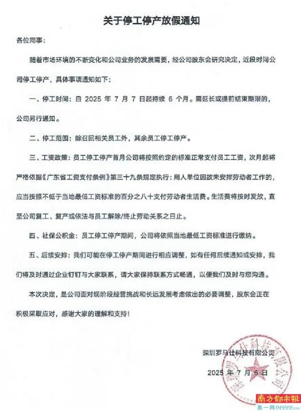一名罗马仕内部人士向南都记者提供的一份停工停产放假通知显示,通知日期为7月6日,落款为深圳罗马仕科技有限公司。通知称,随着市场环境的不断变化和公司业务的发展需要,经公司股东会研究决定,近段时间公司停工停产。停工时间自7月7日起,持续6个月;需延长或提前结束期限的,公司另行通知;除召回相关员工外,其余员工停工停产。
