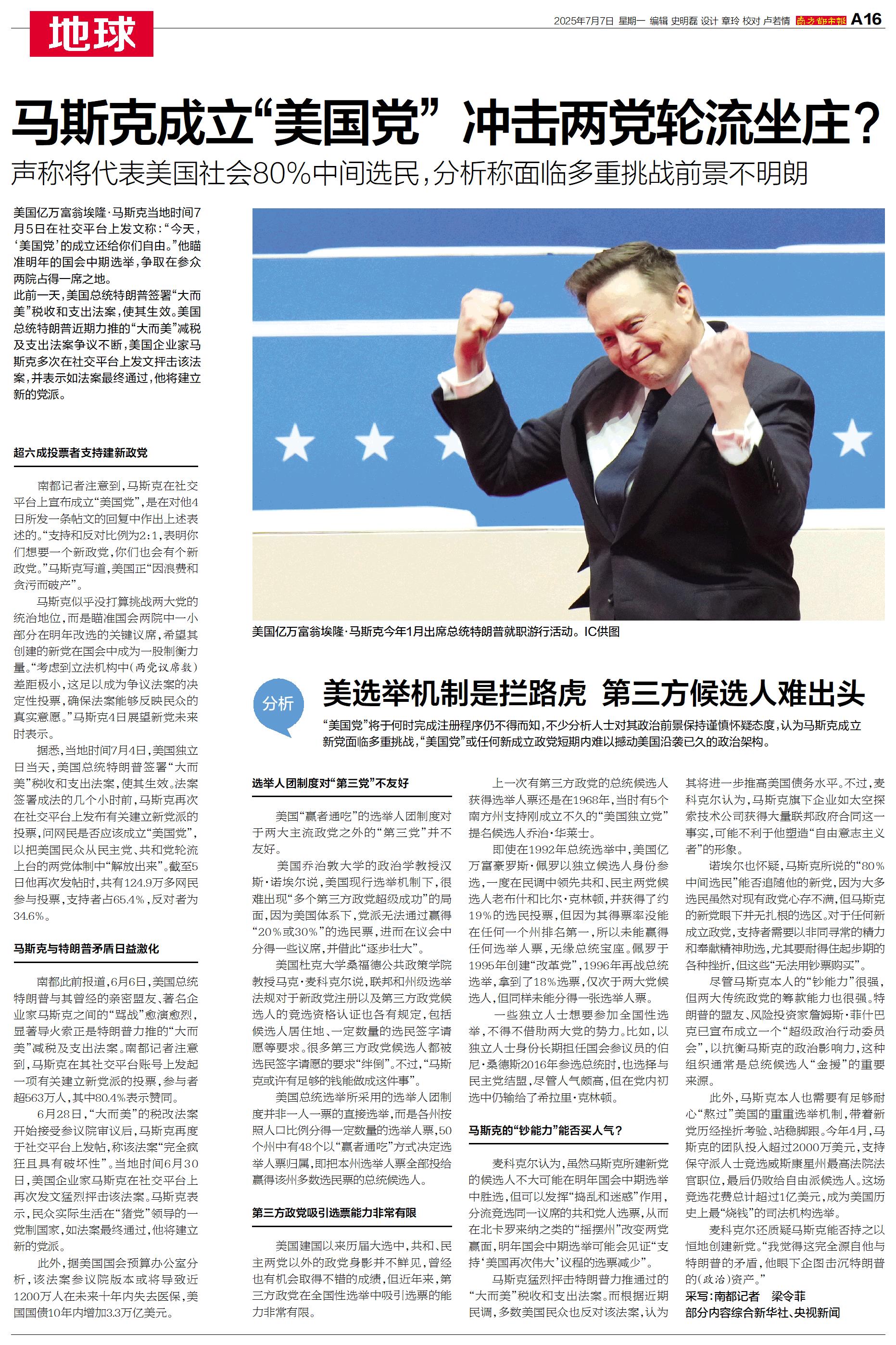 美国亿万富翁埃隆·马斯克当地时间7月5日在社交平台上发文称:“今天,‘美国党’的成立还给你们自由。”他瞄准明年的国会中期选举,争取在参众两院占得一席之地。