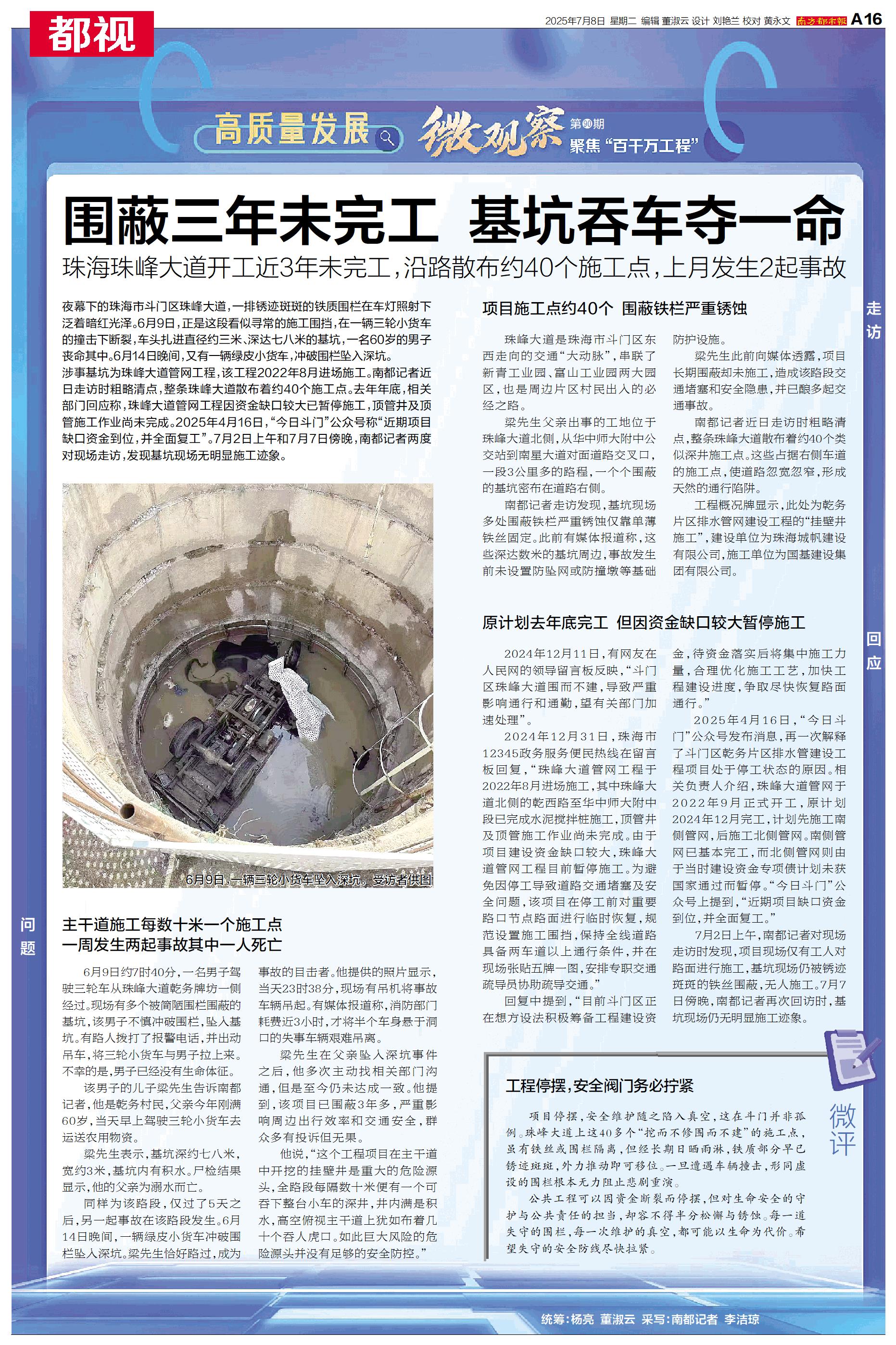 6月9日,正是这段看似寻常的施工围挡,在一辆三轮小货车的撞击下断裂,车头扎进直径约三米、深达七八米的基坑,一名60岁的男子丧命其中。6月14日晚间,又有一辆绿皮小货车,冲破围栏坠入深坑。