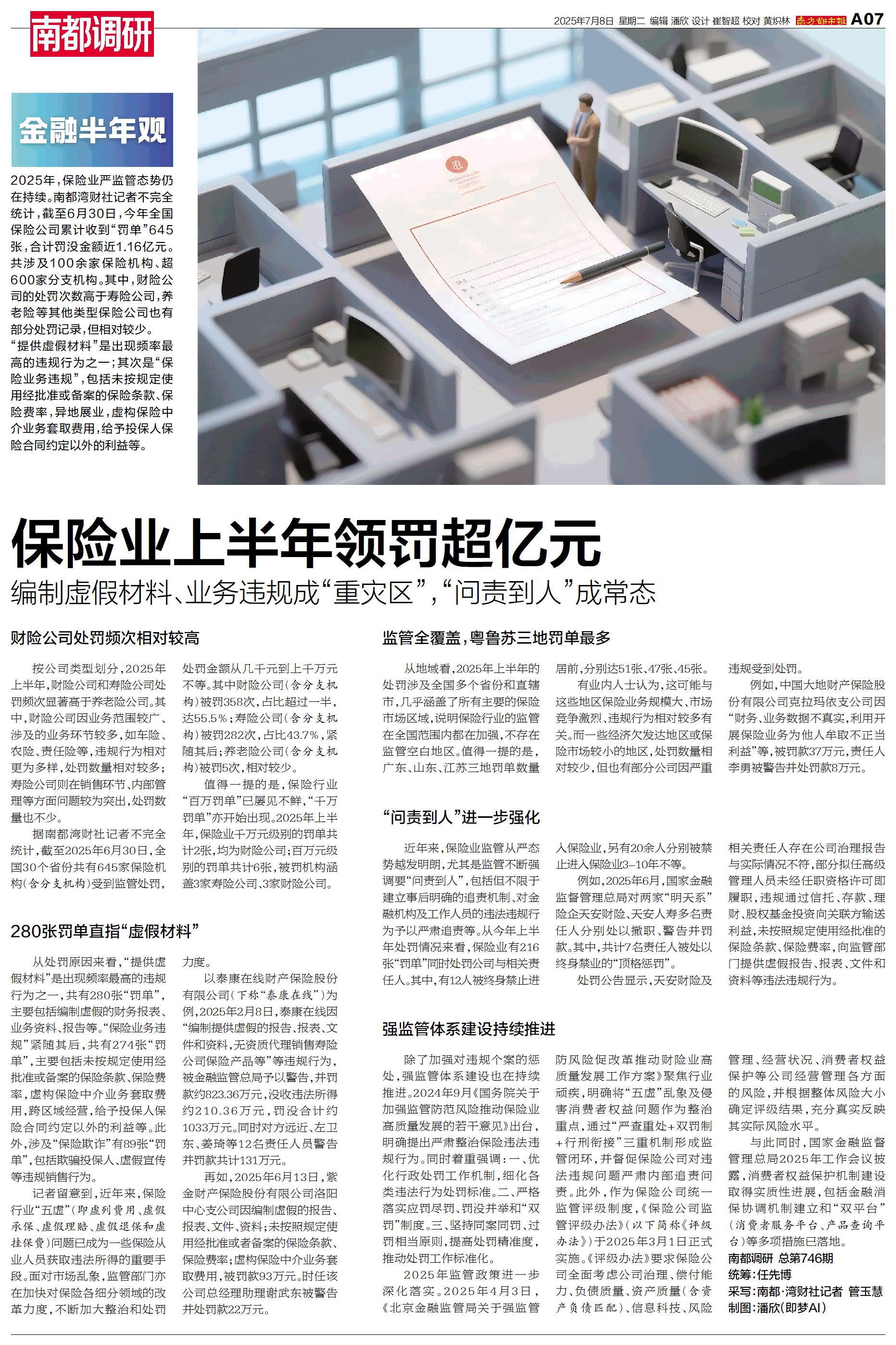2025年,保险业严监管态势仍在持续。南都湾财社记者不完全统计,截至6月30日,今年全国保险公司累计收到“罚单”645张,合计罚没金额近1.16亿元。