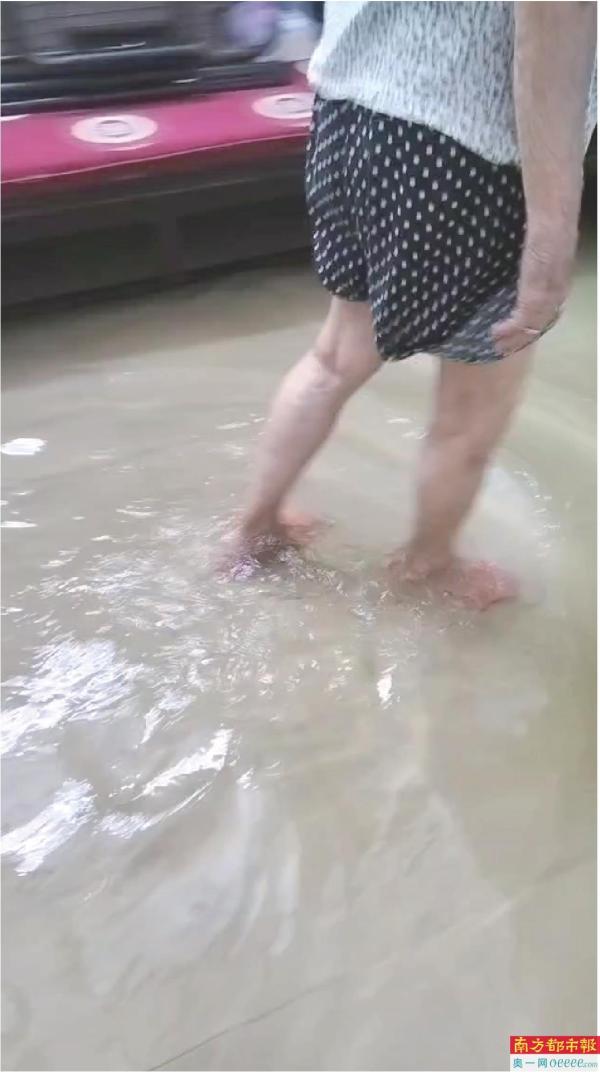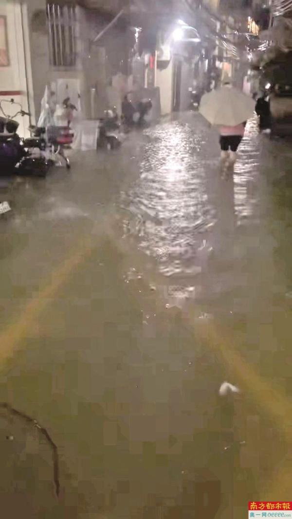 从吴先生提供的视频可见,当晚,聚龙大街积水水深与两侧民居的台阶大概齐平,街边数台电动自行车被浸泡在水中,有行人挽起裤脚涉水缓慢通行。“整条街巷都被浸了,简直无法走,我们日常出行和生活都受到很大影响。”吴先生说,由于聚龙大街地势两头高中间低,高的地方积水高度到达脚踝,雨水最深之处浸至膝盖处。