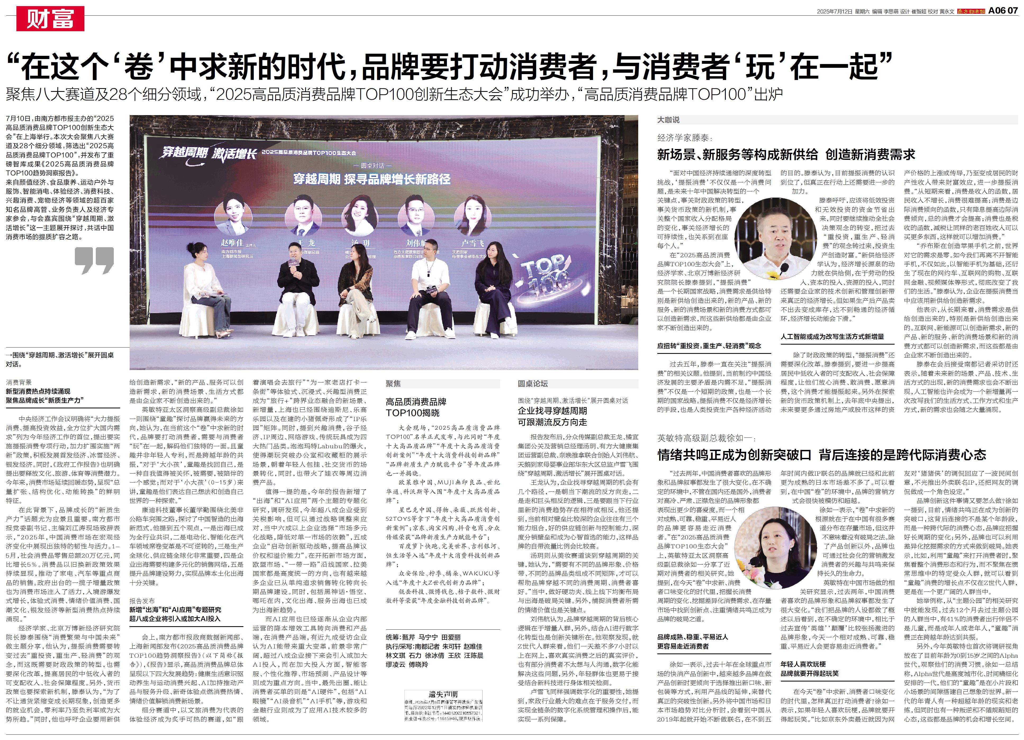 在“2025高品质消费品牌TOP100生态大会”上,经济学家、北京万博新经济研究院院长滕泰提到,“提振消费”是一个长期国家战略,消费需求是供给特别是新供给创造出来的,新的产品、新的服务、新的消费场景和新的消费方式都可以创造新需求,而这些新供给都是由企业家不断创造出来的。