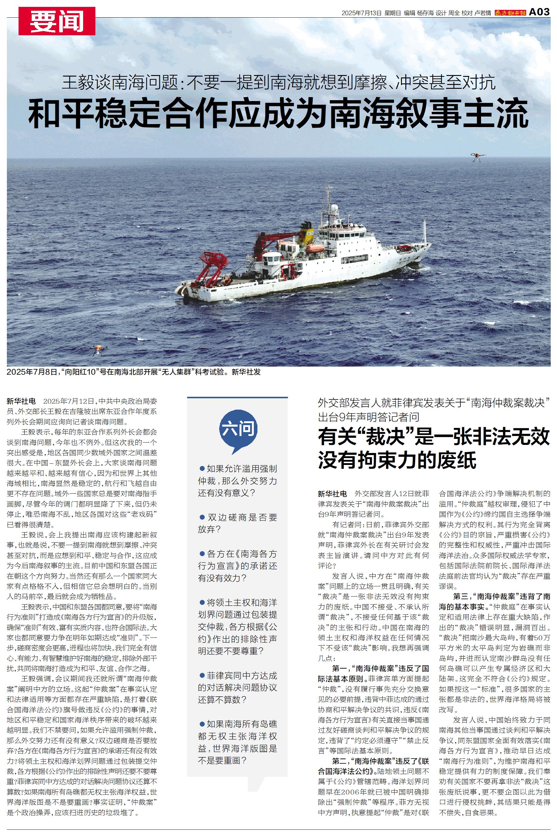 2025年7月12日,中共中央政治局委员、外交部长王毅在吉隆坡出席东亚合作年度系列外长会期间应询向记者谈南海问题。