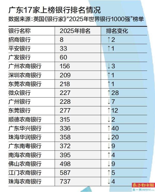 近日,英国《银行家》杂志发布“2025年世界银行1000强”榜单。根据榜单,中国内地有143家银行上榜,其中广东有17家银行。南都湾财社记者梳理发现,与去年相比,广东上榜的17家银行中,过半排名都有所上升,其中有银行排名前进40位。据介绍,英国《银行家》杂志自1970年开始发布“全球银行1000强”榜单,综合不同国家和地区银行的资本实力、经营规模、盈利能力和经营效率等情况,对全球银行进行排名,被视为衡量全球银行综合实力的标尺。