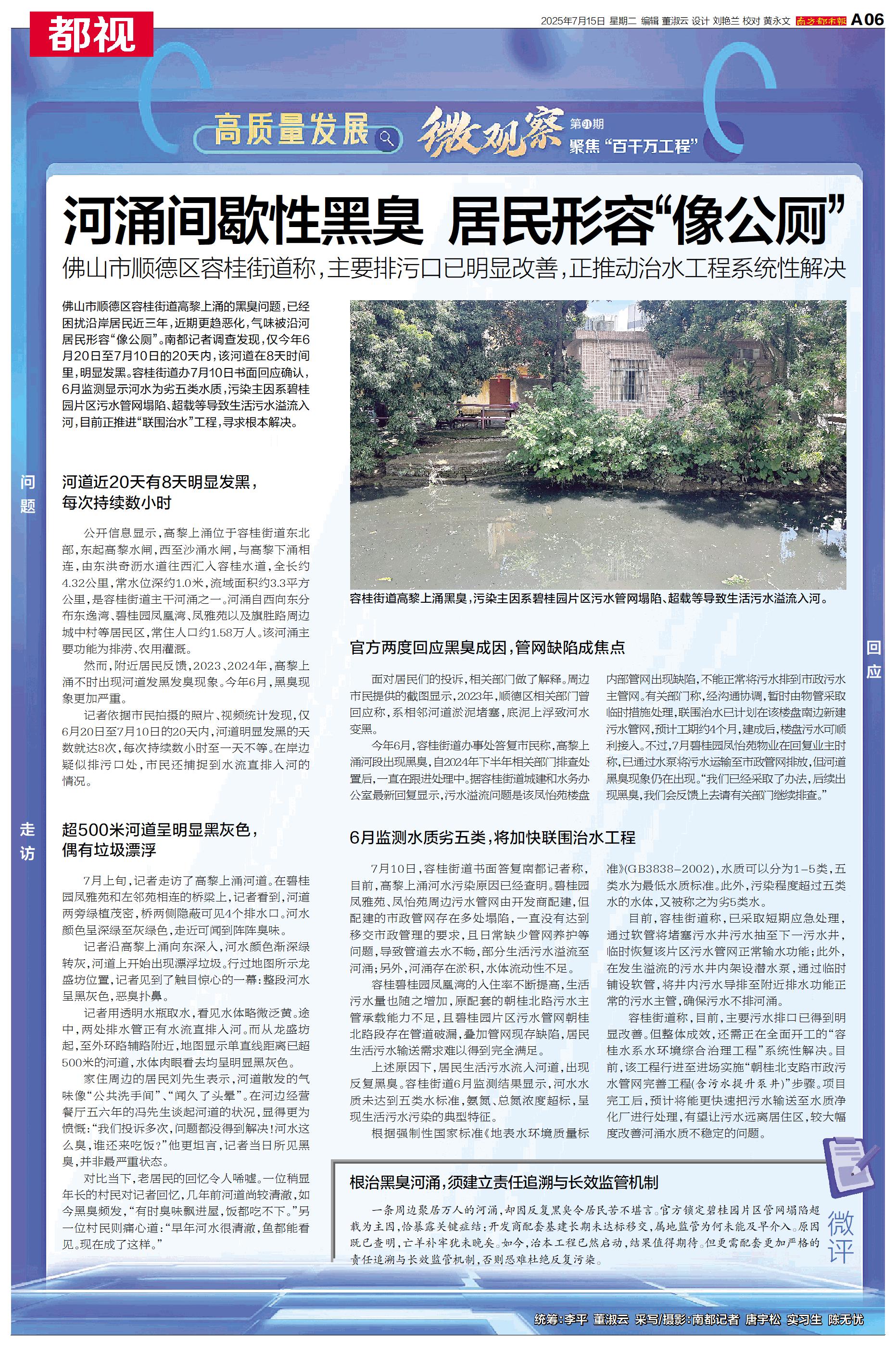 佛山市顺德区容桂街道高黎上涌的黑臭问题,已经困扰沿岸居民近三年,近期更趋恶化,气味被沿河居民形容“像公厕”。
