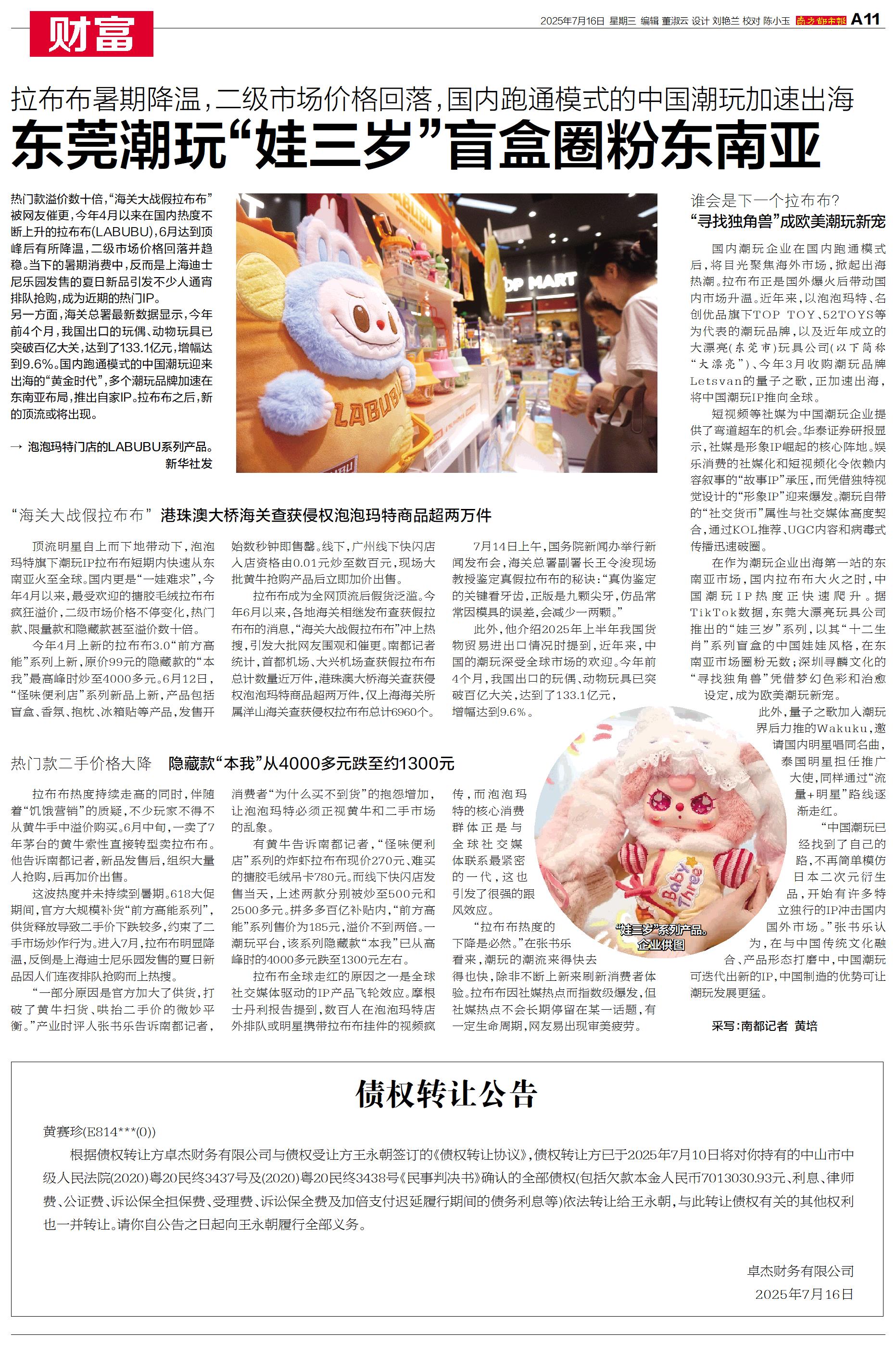 今年4月以来在国内热度不断上升的拉布布(LABUBU),6月达到顶峰后有所降温,二级市场价格回落并趋稳。