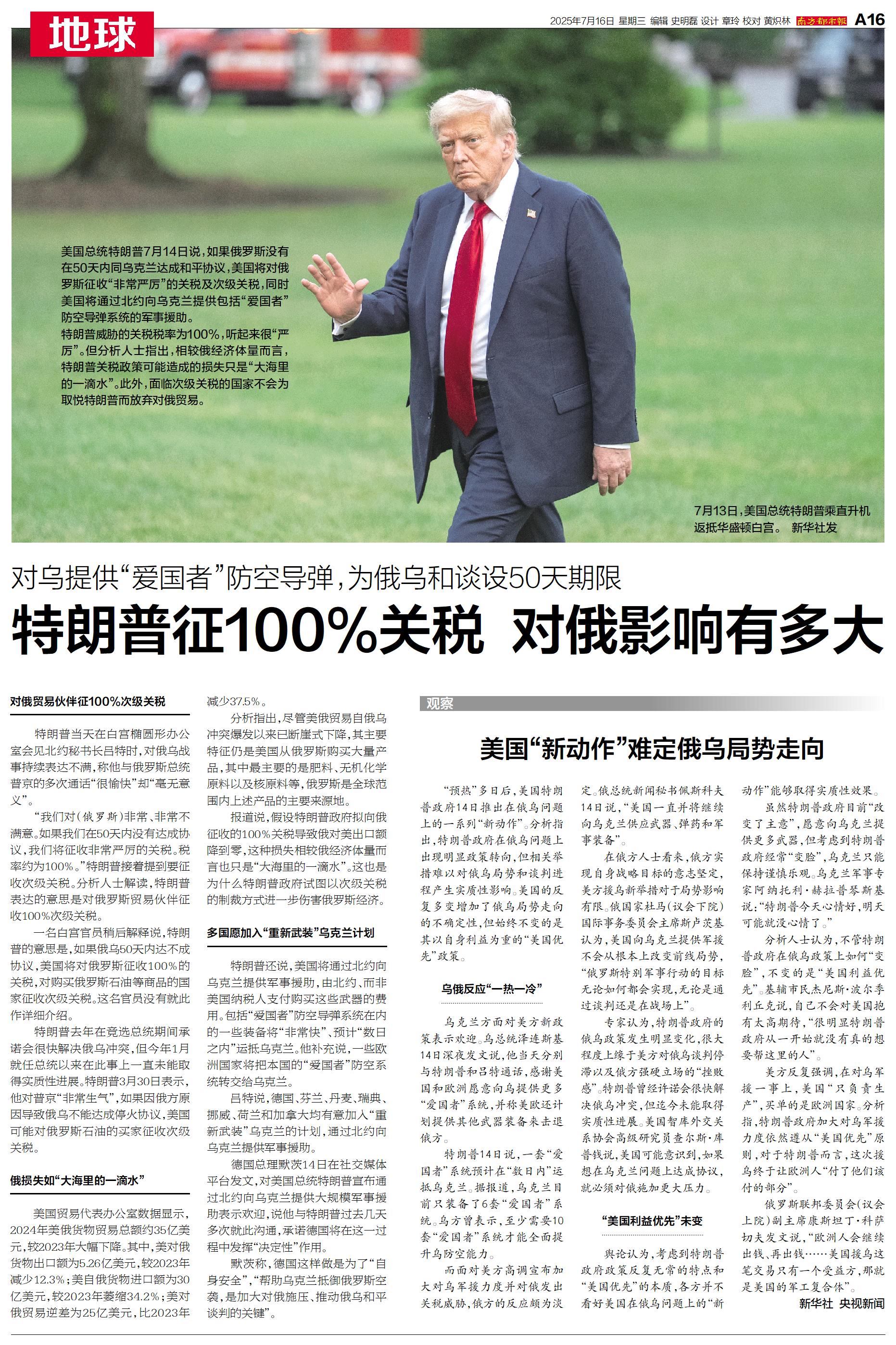 美国总统特朗普7月14日说,如果俄罗斯没有在50天内同乌克兰达成和平协议,美国将对俄罗斯征收“非常严厉”的关税及次级关税,同时美国将通过北约向乌克兰提供包括“爱国者”防空导弹系统的军事援助。