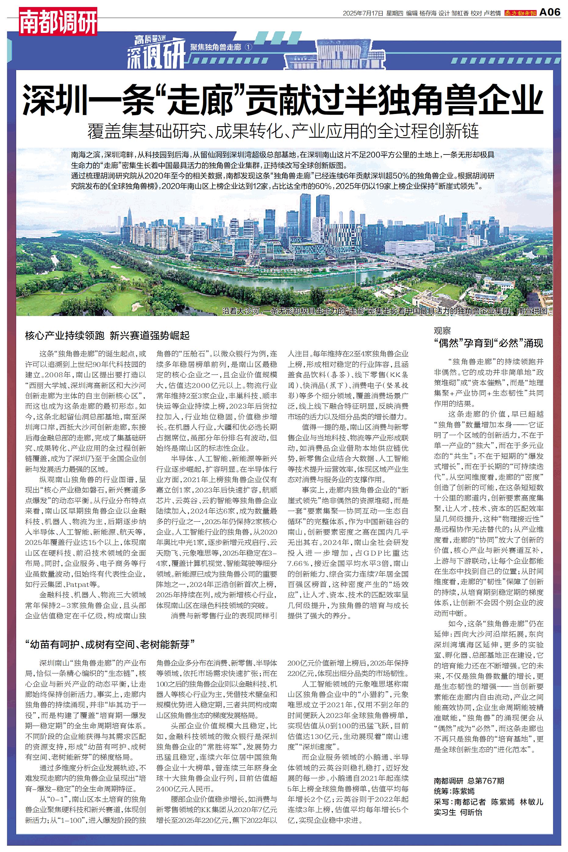 在深圳南山这片不足200平方公里的土地上,一条无形却极具生命力的“走廊”密集生长着中国最具活力的独角兽企业集群,正持续改写全球创新版图。