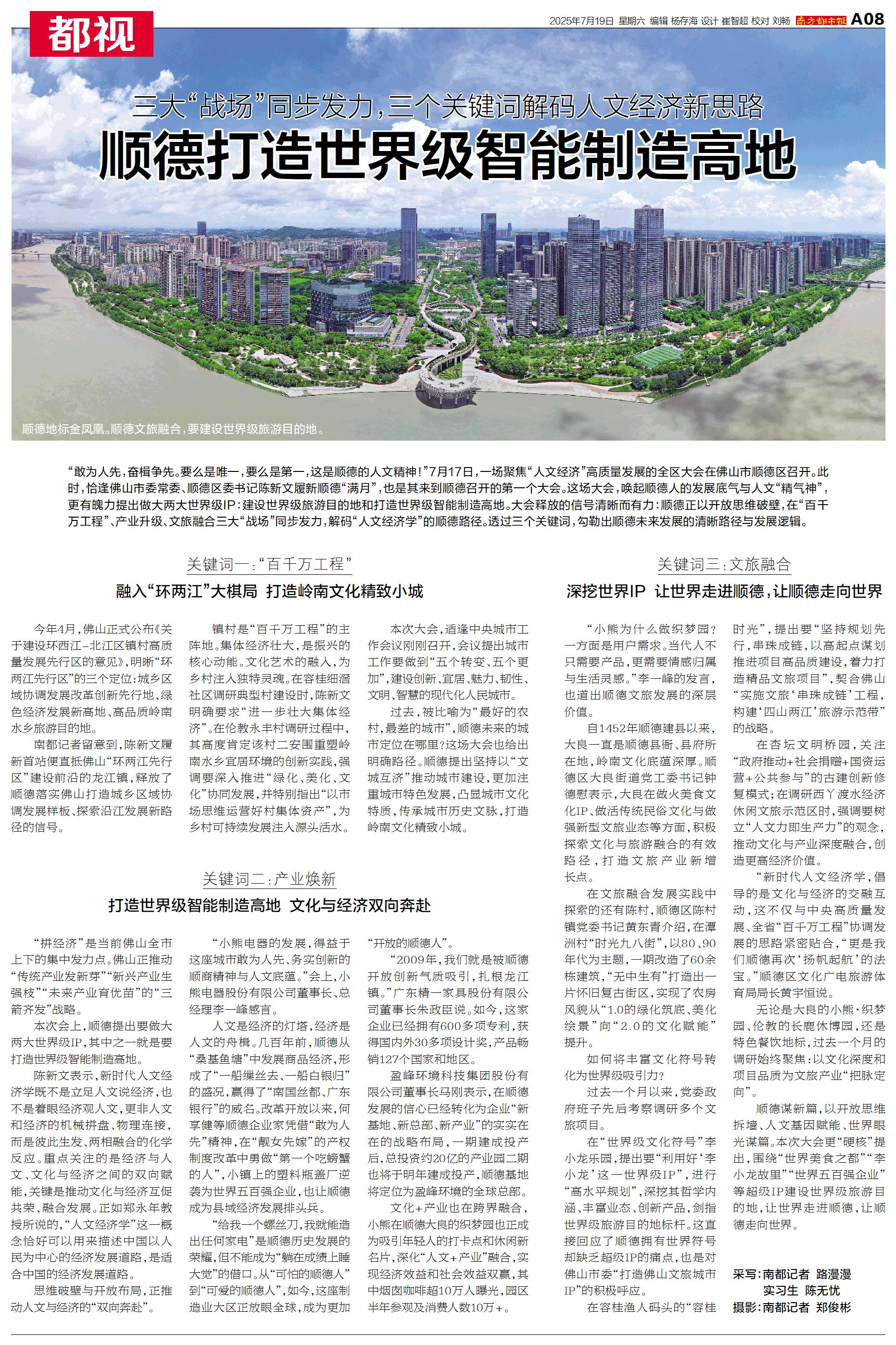 “敢为人先,奋楫争先。要么是唯一,要么是第一,这是顺德的人文精神!”7月17日,一场聚焦“人文经济”高质量发展的全区大会在佛山市顺德区召开。此时,恰逢佛山市委常委、顺德区委书记陈新文履新顺德“满月”,也是其来到顺德召开的第一个大会。这场大会,唤起顺德人的发展底气与人文“精气神”,更有魄力提出做大两大世界级IP:建设世界级旅游目的地和打造世界级智能制造高地。大会释放的信号清晰而有力:顺德正以开放思维破壁,在“百千万工程”、产业升级、文旅融合三大“战场”同步发力,解码“人文经济学”的顺德路径。透过三个关键词,勾勒出顺德未来发展的清晰路径与发展逻辑。