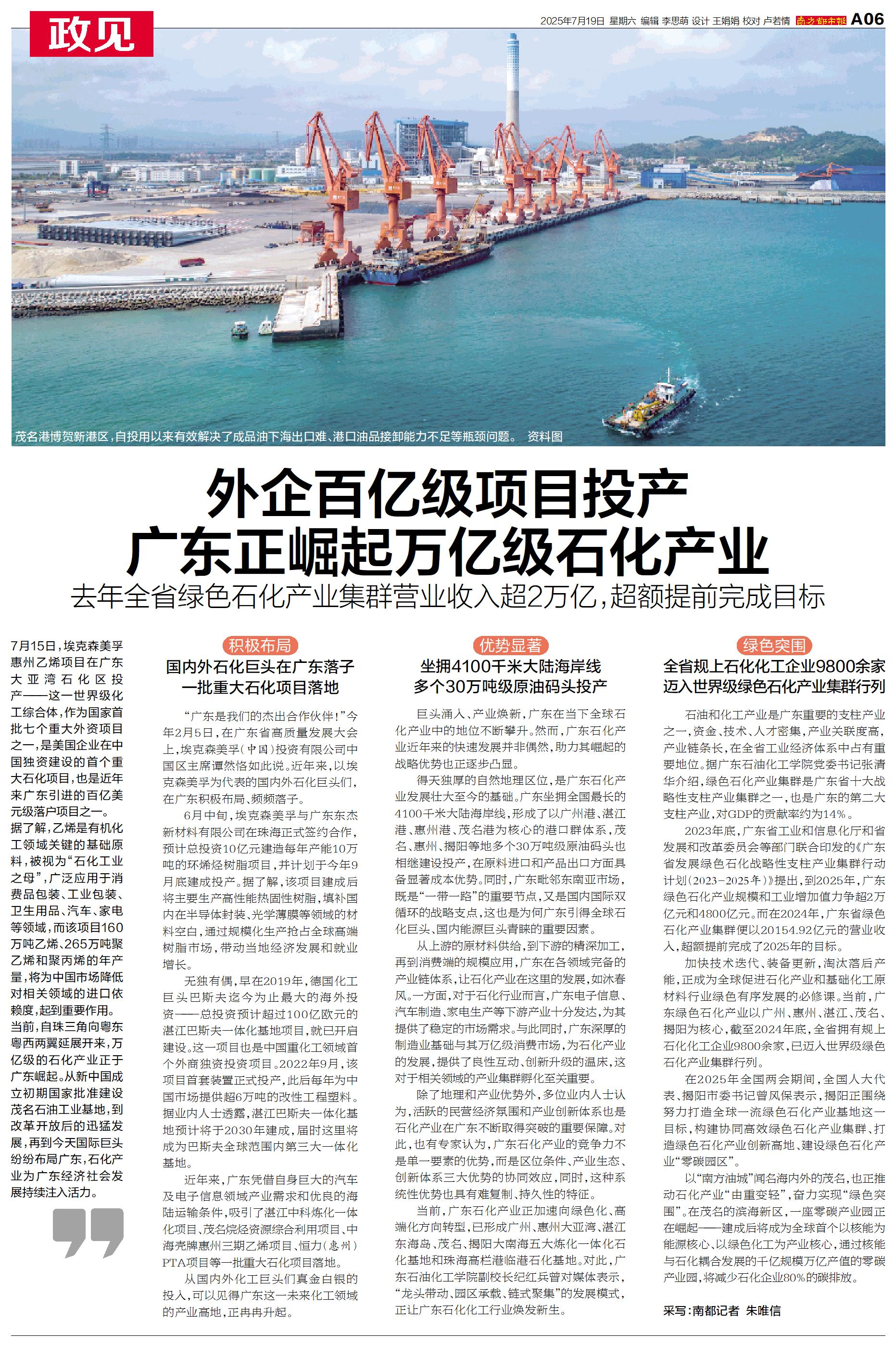 加快技术迭代、装备更新,淘汰落后产能,正成为全球促进石化产业和基础化工原材料行业绿色有序发展的必修课。当前,广东绿色石化产业以广州、惠州、湛江、茂名、揭阳为核心,截至2024年底,全省拥有规上石化化工企业9800余家,已迈入世界级绿色石化产业集群行列。