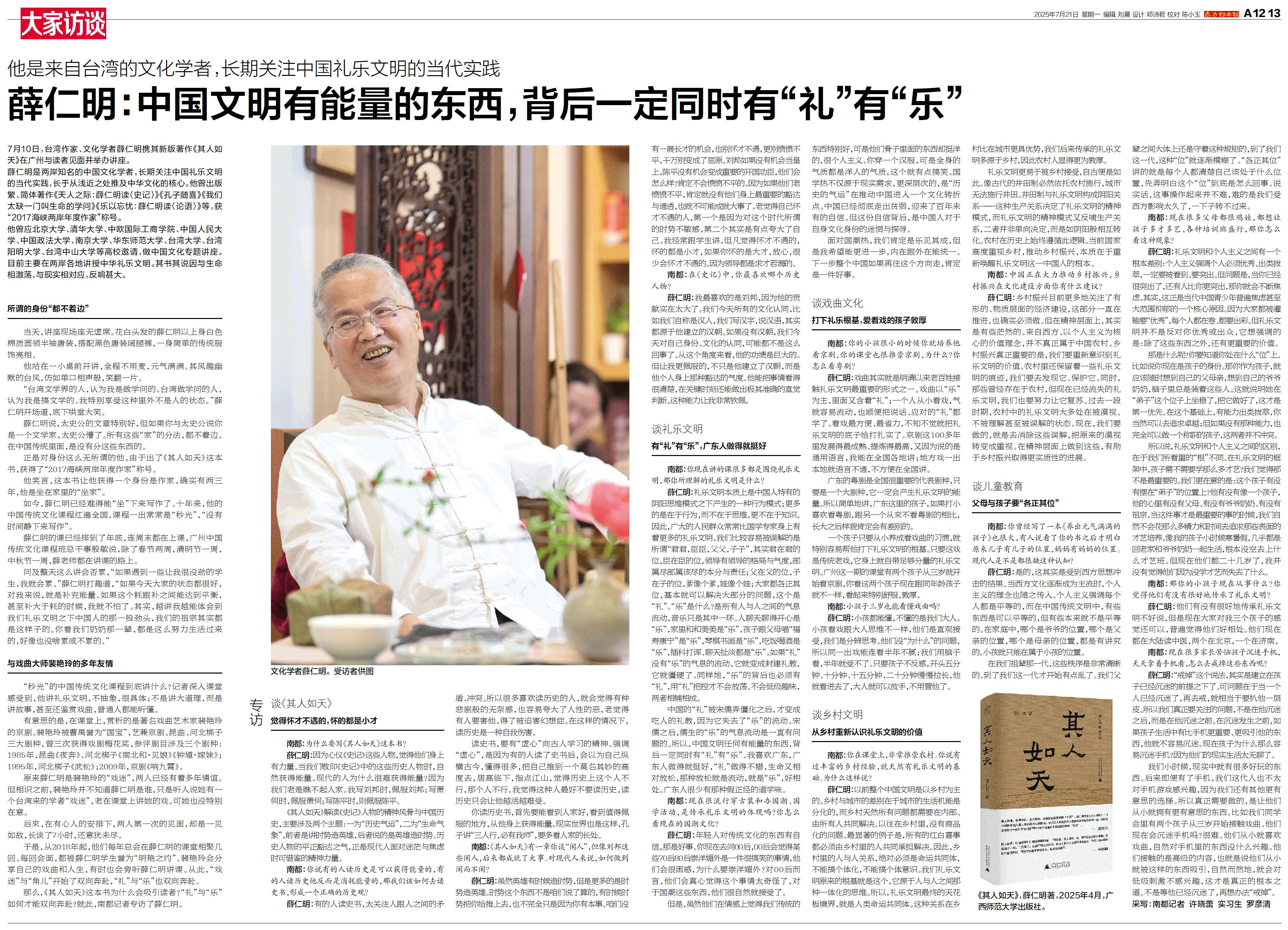 7月10日,台湾作家、文化学者薛仁明携其新版著作《其人如天》在广州与读者见面并举办讲座。