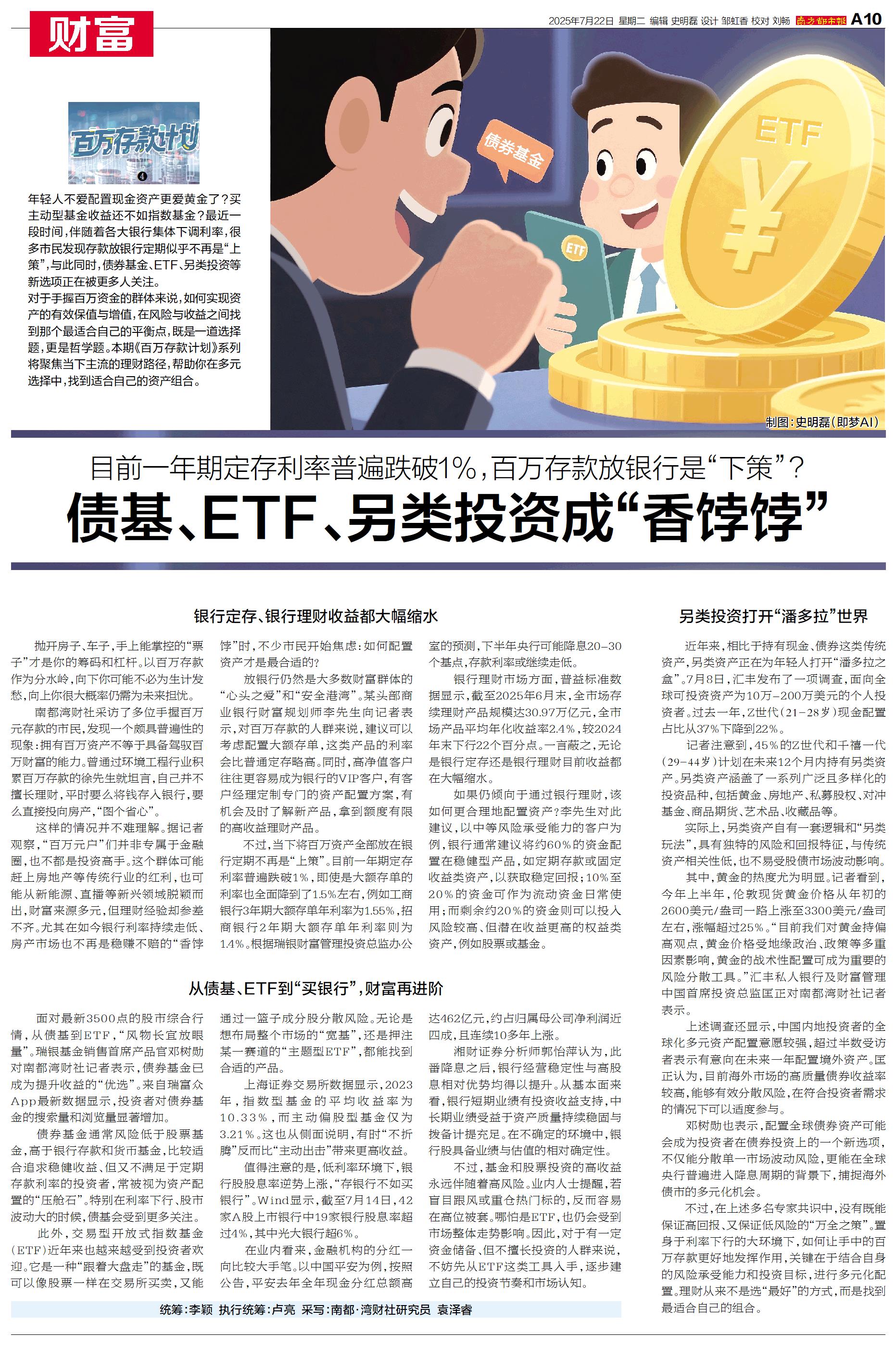 最近一段时间,伴随着各大银行集体下调利率,很多市民发现存款放银行定期似乎不再是“上策”,与此同时,债券基金、ETF、另类投资等新选项正在被更多人关注。