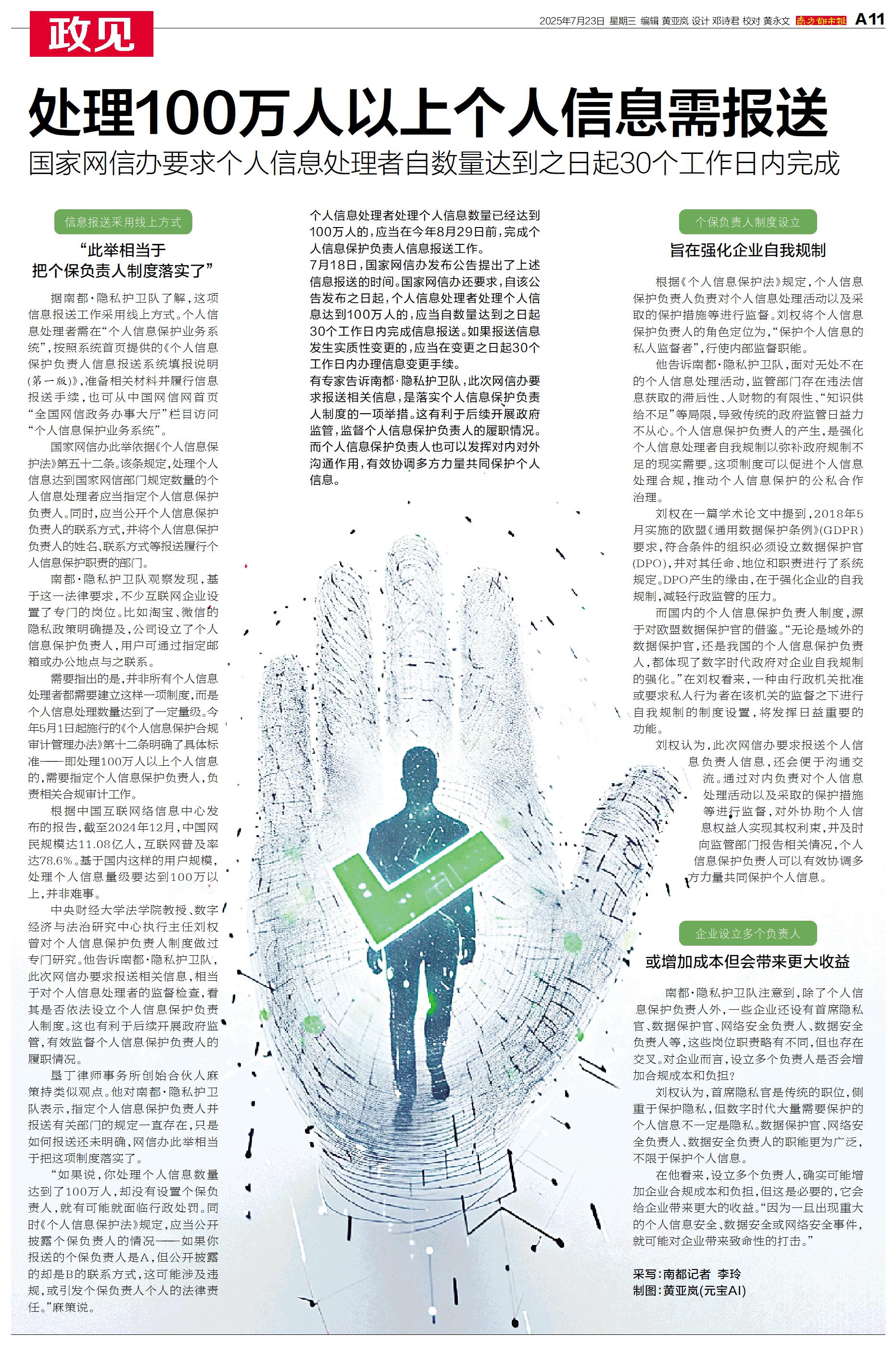 个人信息处理者处理个人信息数量已经达到100万人的,应当在今年8月29日前,完成个人信息保护负责人信息报送工作。