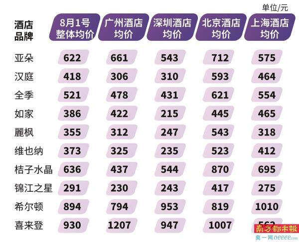 从整体来看,北京和上海的酒店均价普遍高于广州和深圳。以7月20日为例,北京的整体零售均价为550元(汉庭)至1062元(喜来登),上海为507元(亚朵)至956元(希尔顿),而广州和深圳的均价多集中在300元至500元区间。8月1日的数据显示类似趋势,北京和上海的高端品牌(如希尔顿、喜来登)价格,仍显著高于广深两地。