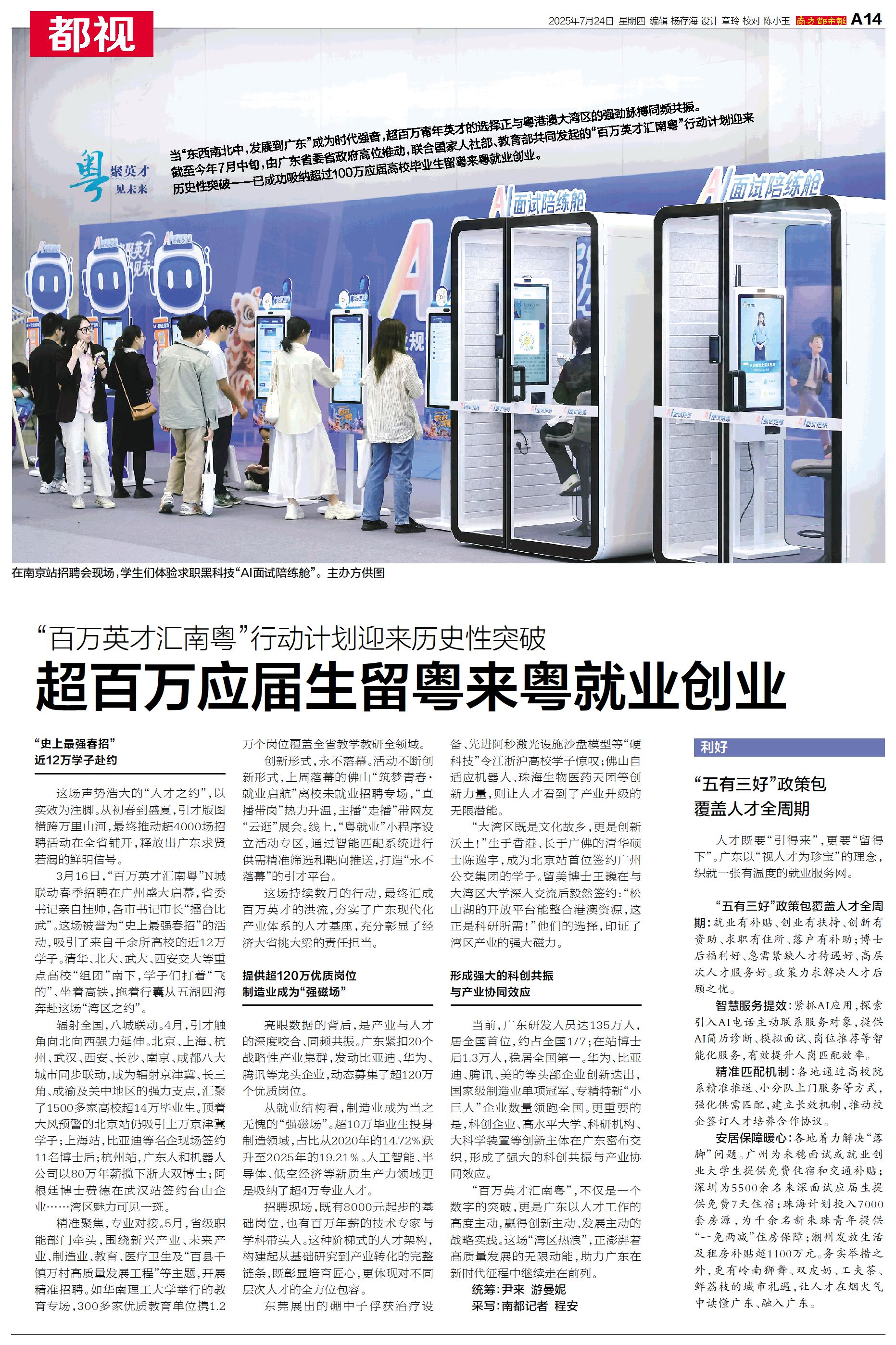 截至今年7月中旬,由广东省委省政府高位推动,联合国家人社部、教育部共同发起的“百万英才汇南粤”行动计划迎来历史性突破——已成功吸纳超过100万应届高校毕业生留粤来粤就业创业。