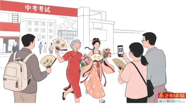 家长想要“薅羊毛”,就需要留下联系方式。这些地推人员多为退休阿姨、兼职大学生,有的阿姨特意和接考的家长一样,穿上了红色、绿色的旗袍,营造出一种亲切、喜庆的氛围;还有一些年轻人则身着全套汉服,吸引众人目光。