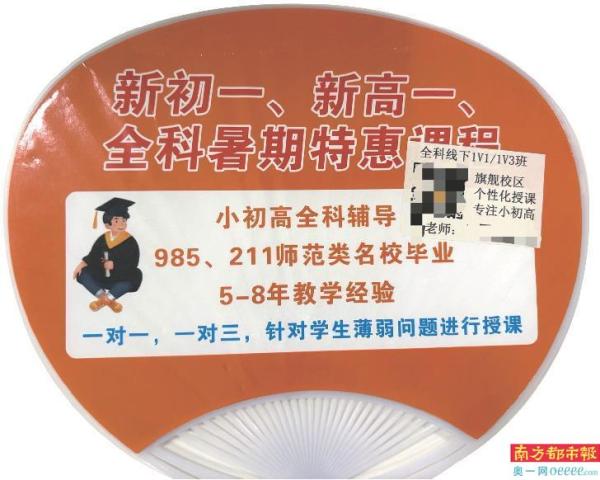 记者领取的扇子上,有学科辅导招生广告信息,并附有老师的联系方式和介绍。