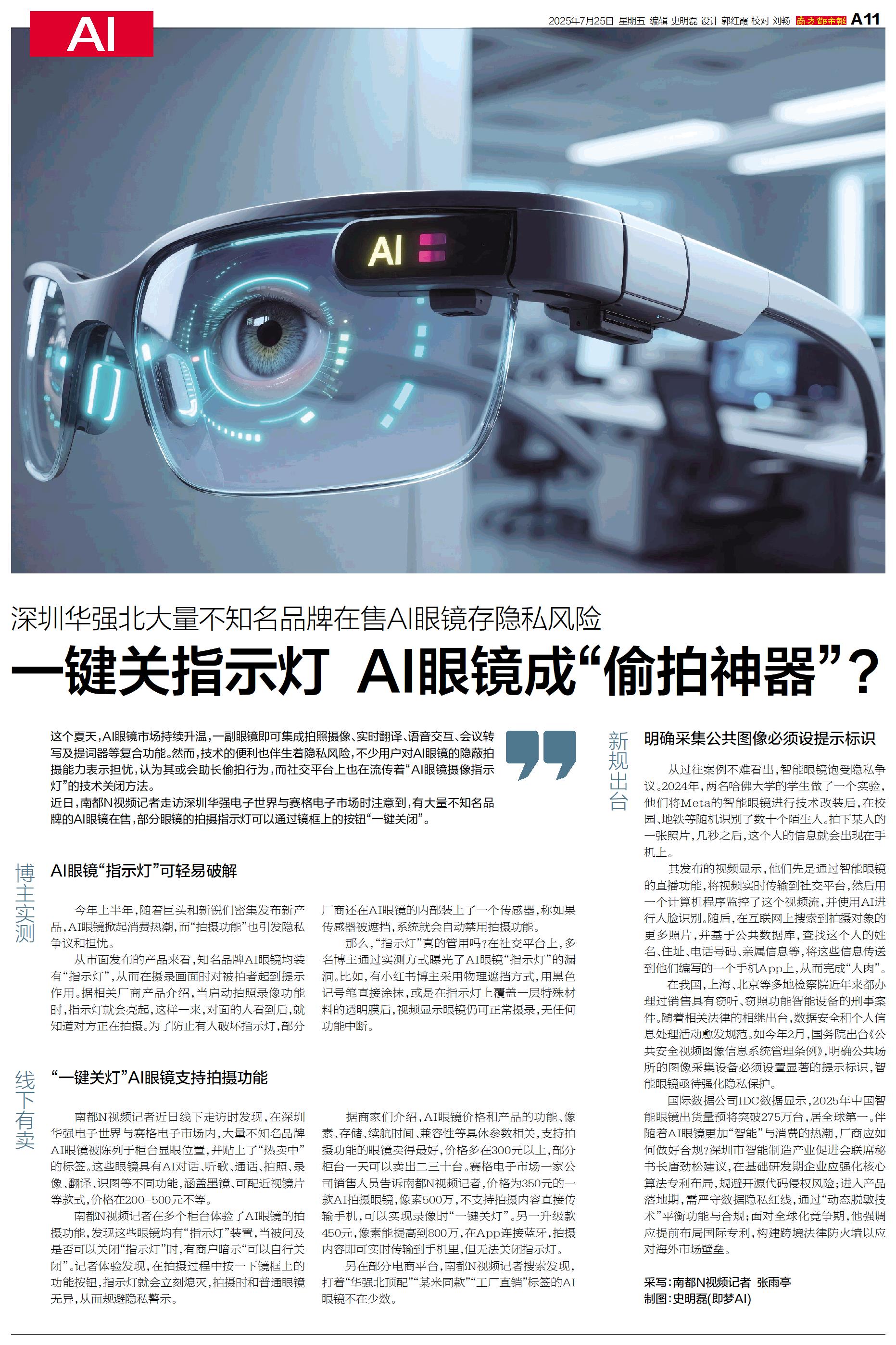 一键关指示灯 AI眼镜成“偷拍神器”?