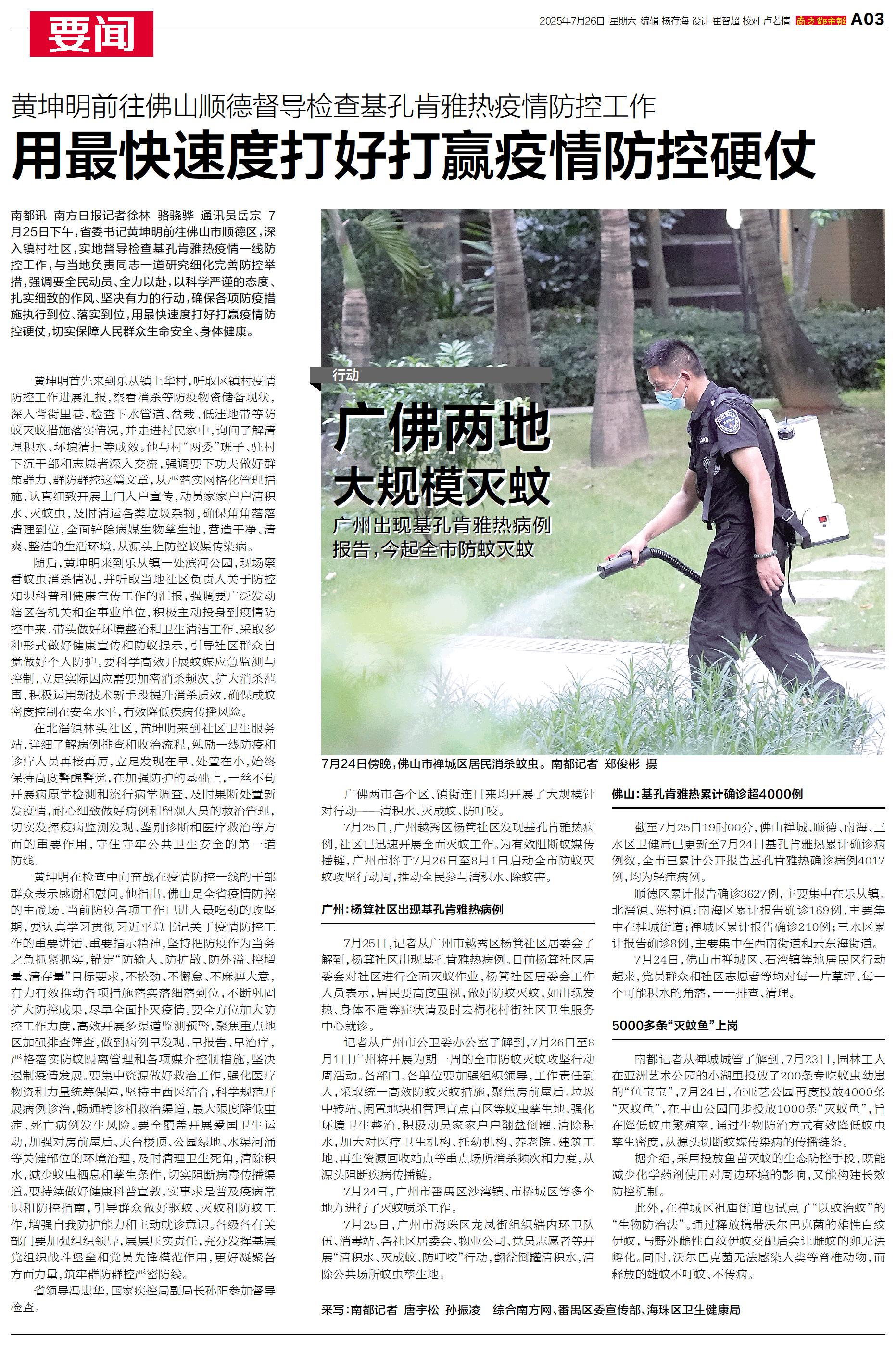 7月25日,广州越秀区杨箕社区发现基孔肯雅热病例,社区已迅速开展全面灭蚊工作。为有效阻断蚊媒传播链,广州市将于7月26日至8月1日启动全市防蚊灭蚊攻坚行动周,推动全民参与清积水、除蚊害。