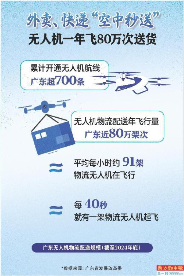 一架无人机贴着浪花掠过,把刚出水的海鲜送到对岸的厨房;城市楼宇之间,提着外卖的无人机稳稳降下,把刚出炉的下午茶送到上班族手中……万物皆可飞抵,这些只在科幻电影里出现过的场景已照进现实,“飞”入广东城市日常生活。数据显示,广东无人机物流配送年飞行近80万架次。算下来,平均每40秒就有一架物流无人机腾空。
