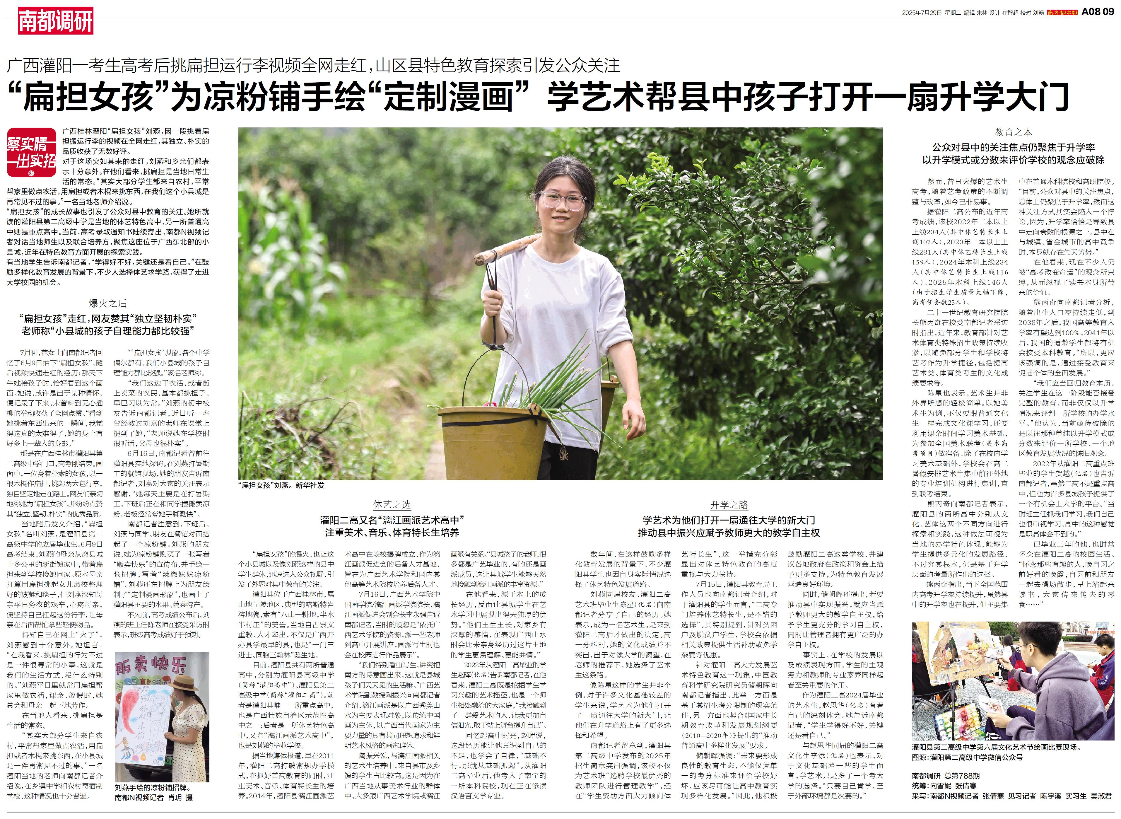 “扁担女孩”的成长故事也引发了公众对县中教育的关注。她所就读的灌阳县第二高级中学是当地的体艺特色高中,另一所普通高中则是重点高中。当前,高考录取通知书陆续寄出,南都N视频记者对话当地师生以及联合培养方,聚焦这座位于广西东北部的小县城,近年在特色教育方面开展的探索实践。