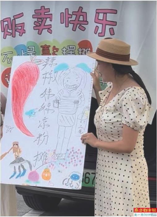 南都记者注意到,下班后,刘燕与同学、朋友在餐馆对面搭起了一个凉粉铺。刘燕的朋友说,她为凉粉铺购买了一张写着“贩卖快乐”的宣传布,并手绘一张招牌,写着“辣椒妹妹凉粉铺”。刘燕还在招牌上为朋友绘制了“定制漫画形象”,也画上了灌阳县主要的水果、蔬菜特产。