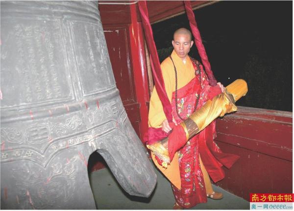 2007年8月7日晚,洛阳白马寺方丈印乐法师撞响108声吉祥钟声,祝福北京奥运会成功举行。 新华社资料图