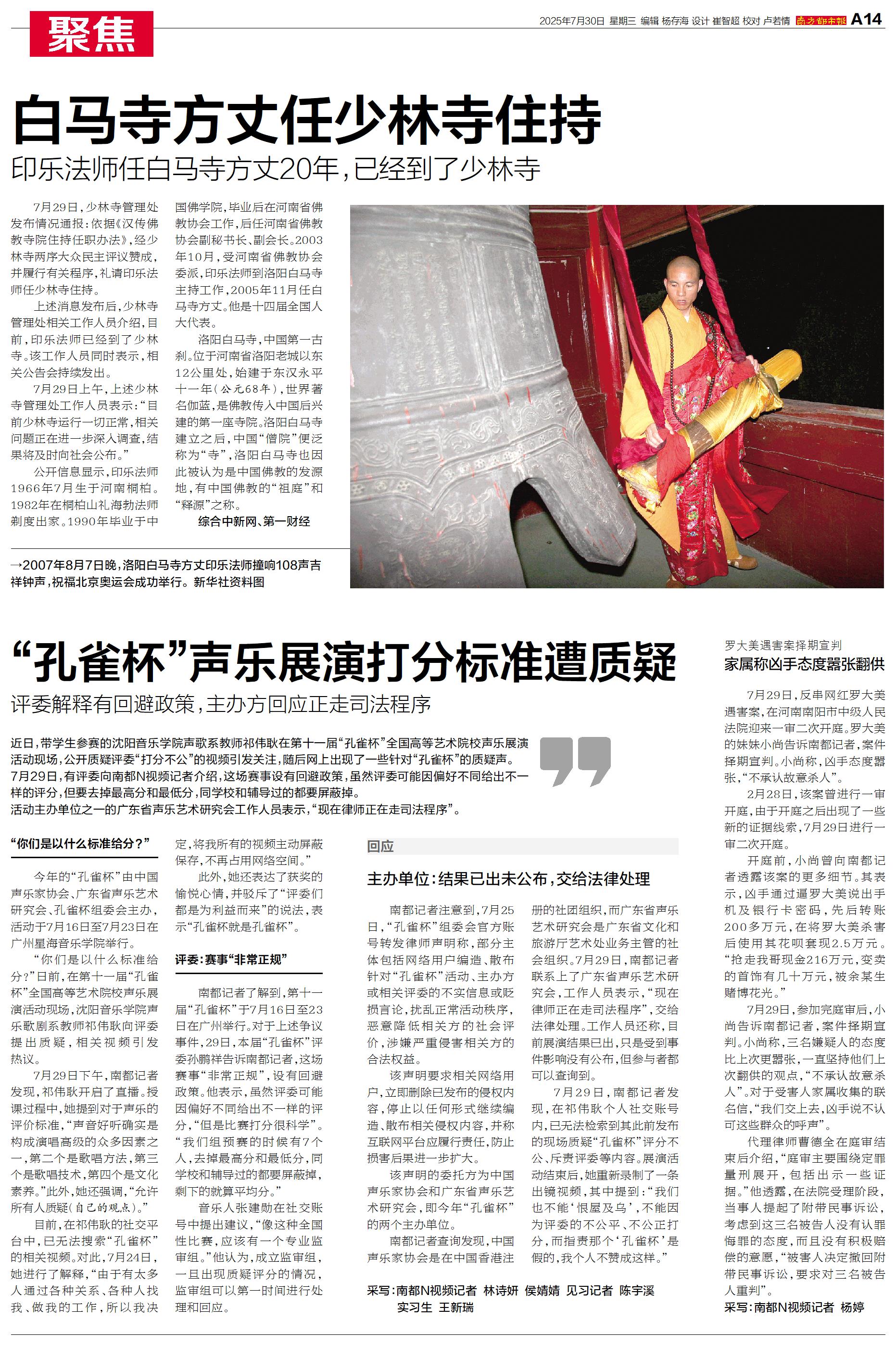7月29日,少林寺管理处发布情况通报:依据《汉传佛教寺院住持任职办法》,经少林寺两序大众民主评议赞成,并履行有关程序,礼请印乐法师任少林寺住持。