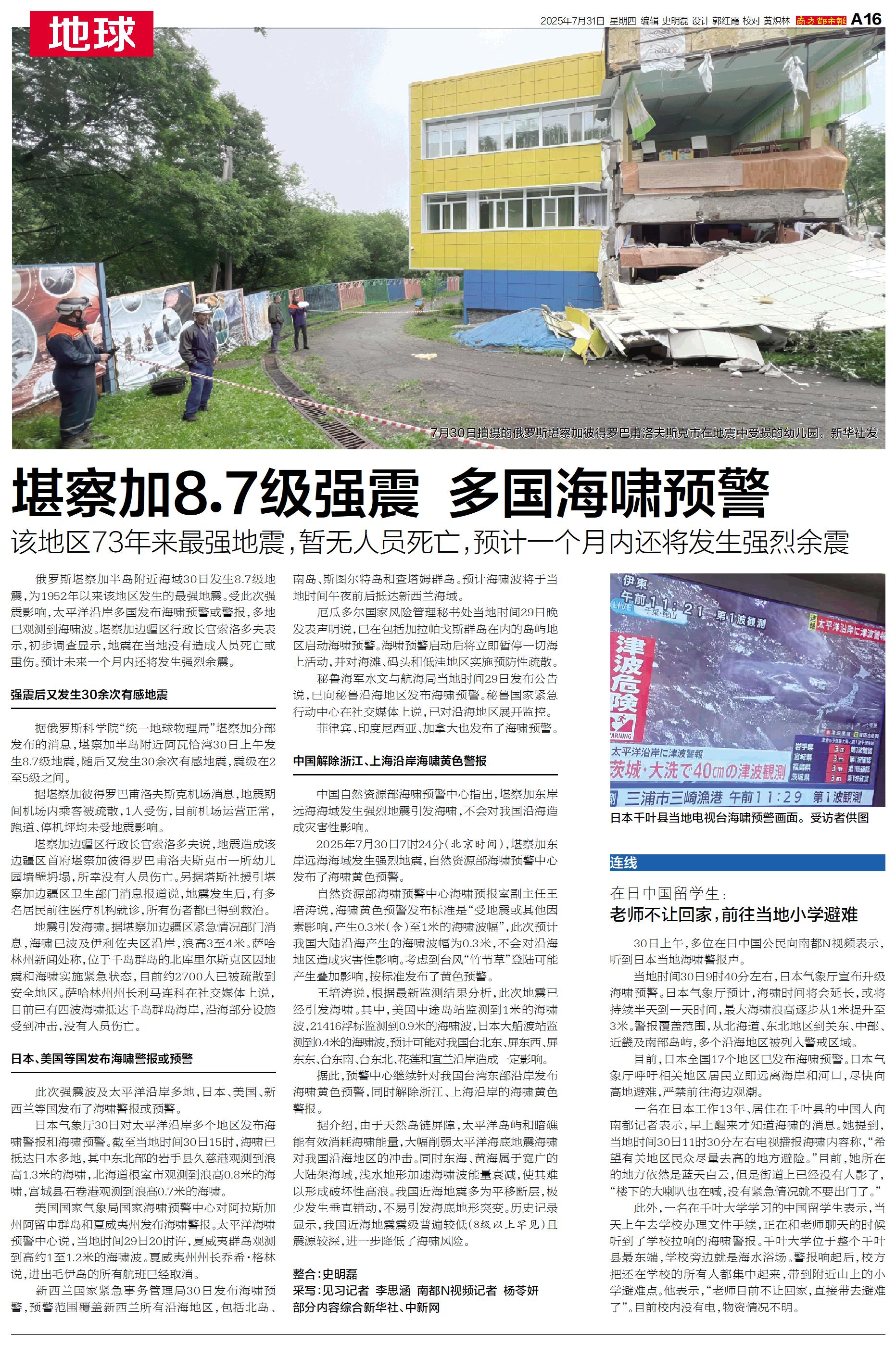 俄罗斯堪察加半岛附近海域30日发生8.7级地震,为1952年以来该地区发生的最强地震。