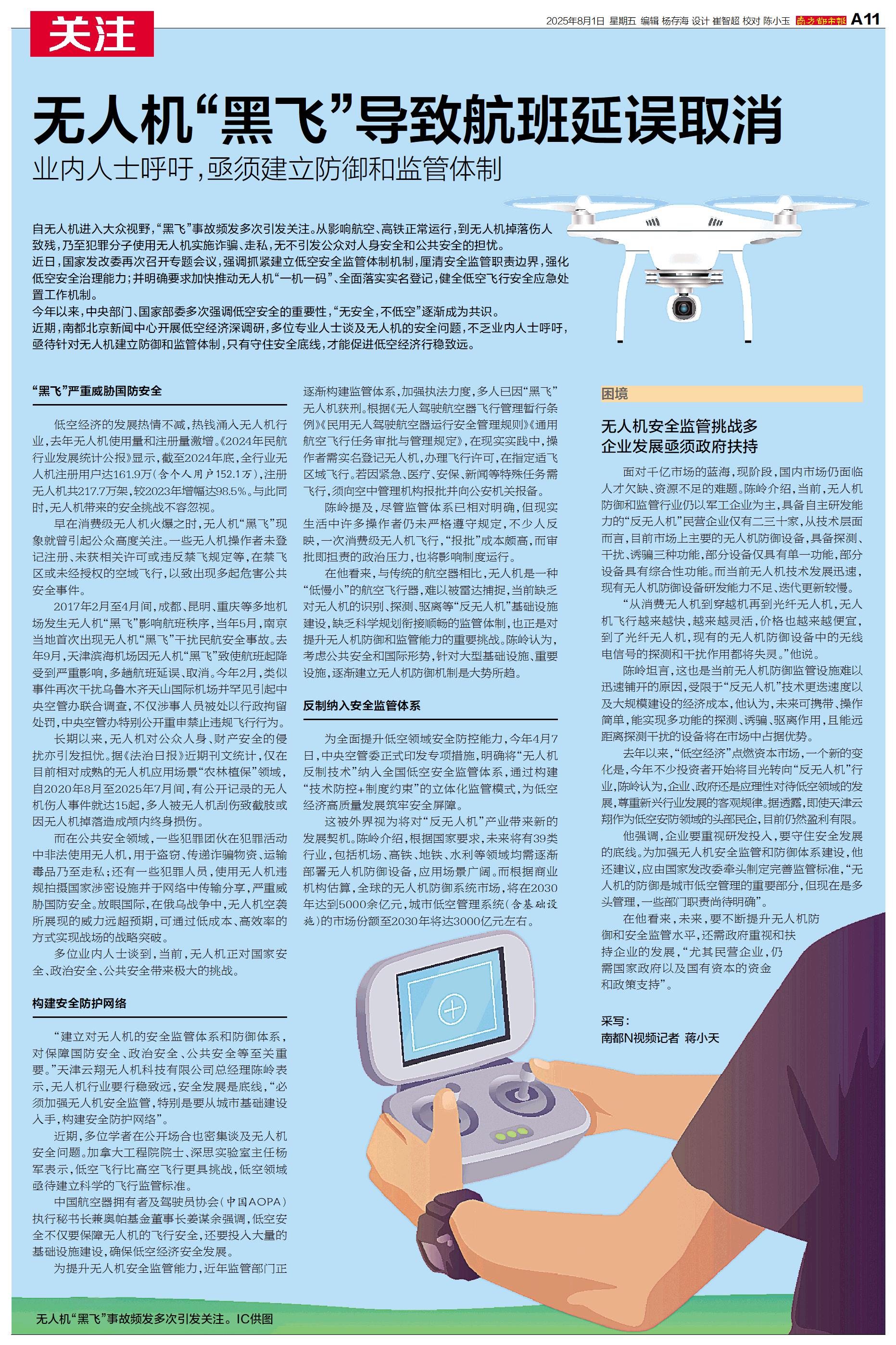 他强调,企业要重视研发投入,要守住安全发展的底线。为加强无人机安全监管和防御体系建设,他还建议,应由国家发改委牵头制定完善监管标准,“无人机的防御是城市低空管理的重要部分,但现在是多头管理,一些部门职责尚待明确”。